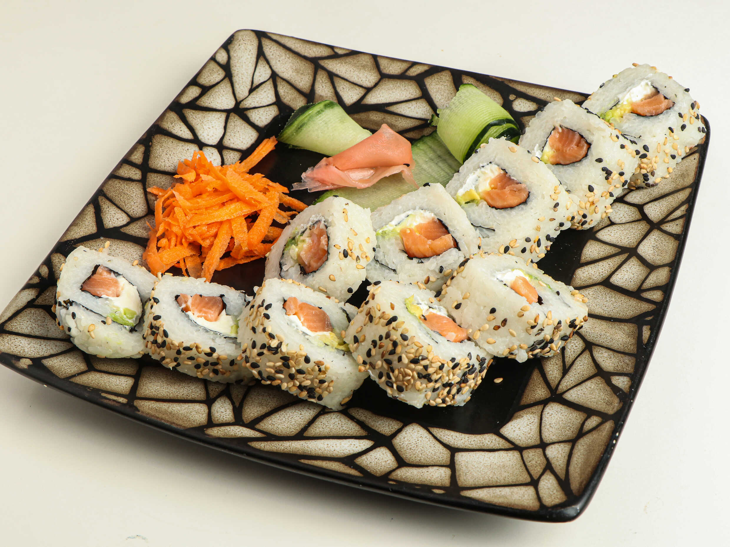 200 gramos de arroz, por dentro salmón fresco, pepino, zanahoria, por fuera queso filadelfia y mango