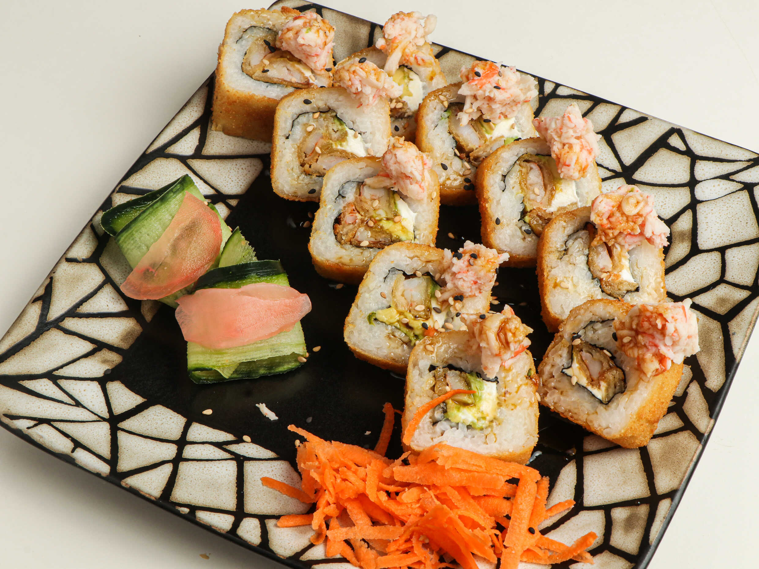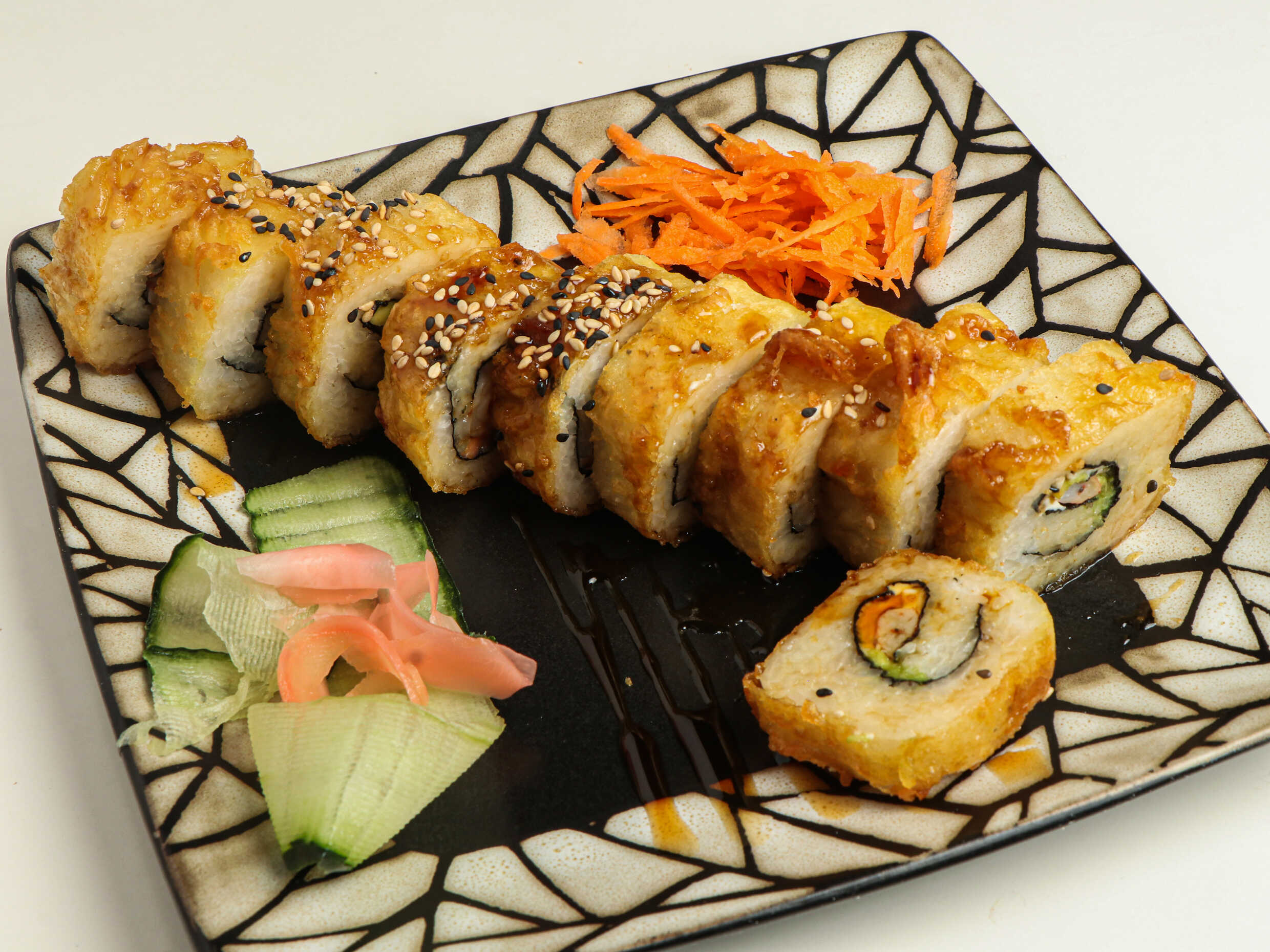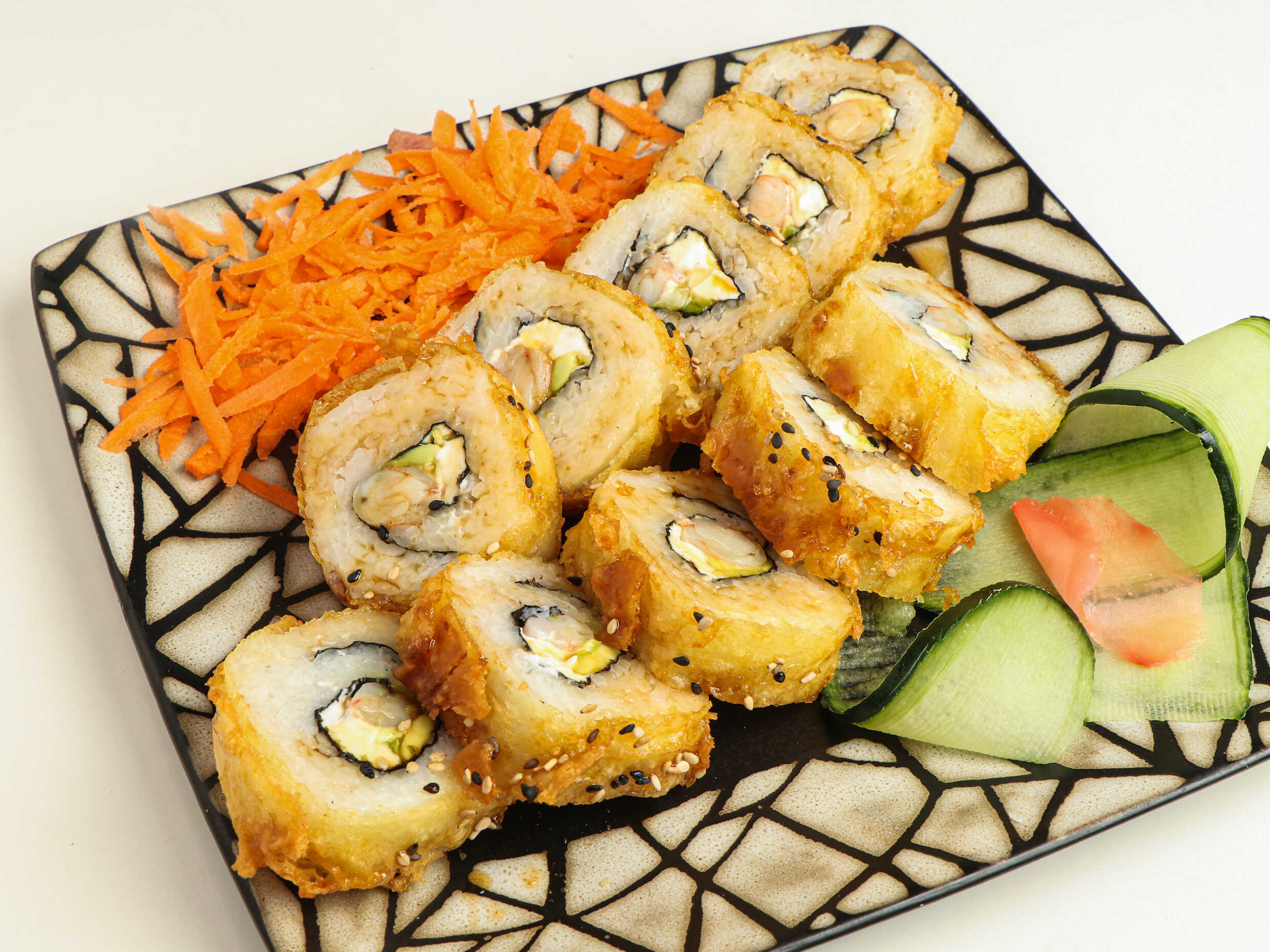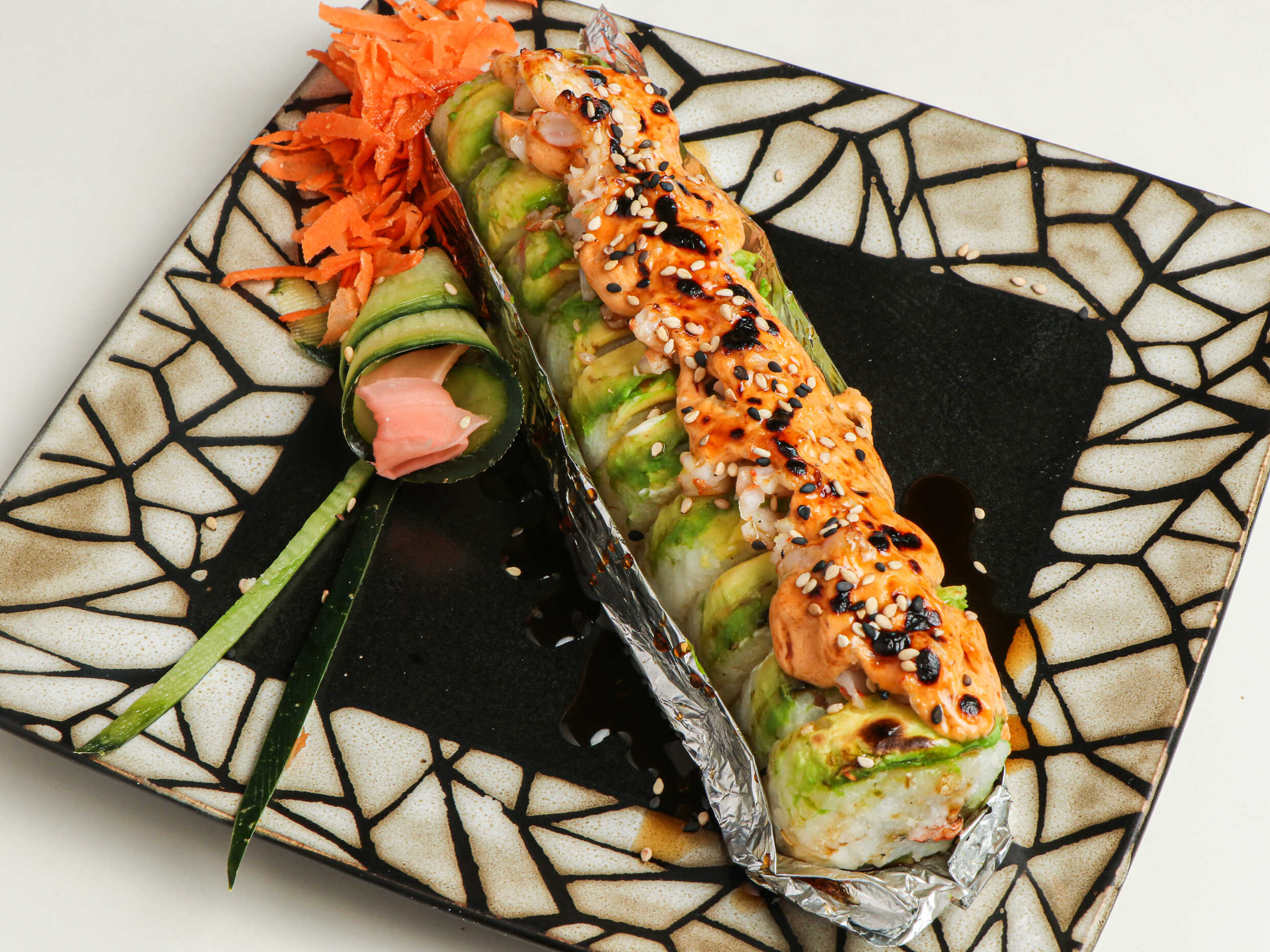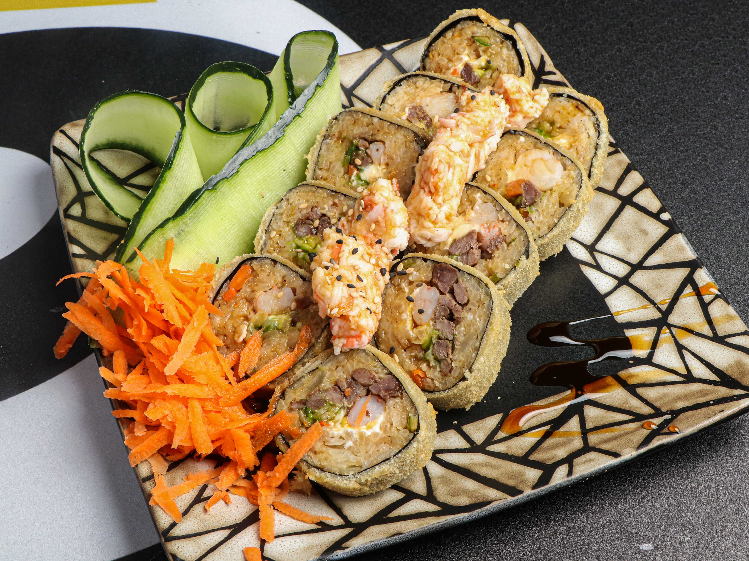 200 gramos de arroz frito, relleno de salmón, queso Filadelfia, pepino y aguacate, cubierto con salsa de anguila y ajonjolí.