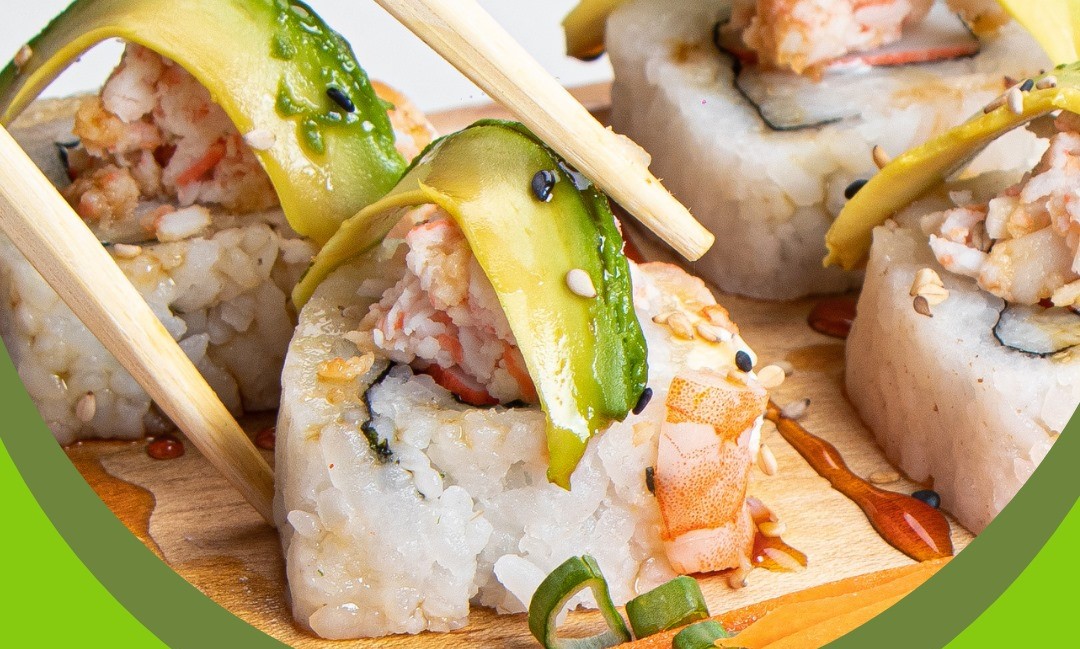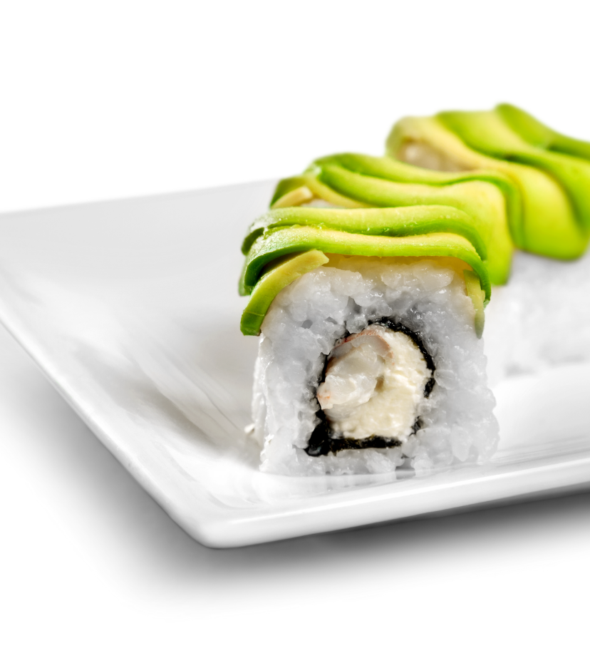 200 gramos de arroz, por dentro surimi de cangrejo, mango, queso filadelfia, por fuera aguacate y aderezo de mango y ajonjolí