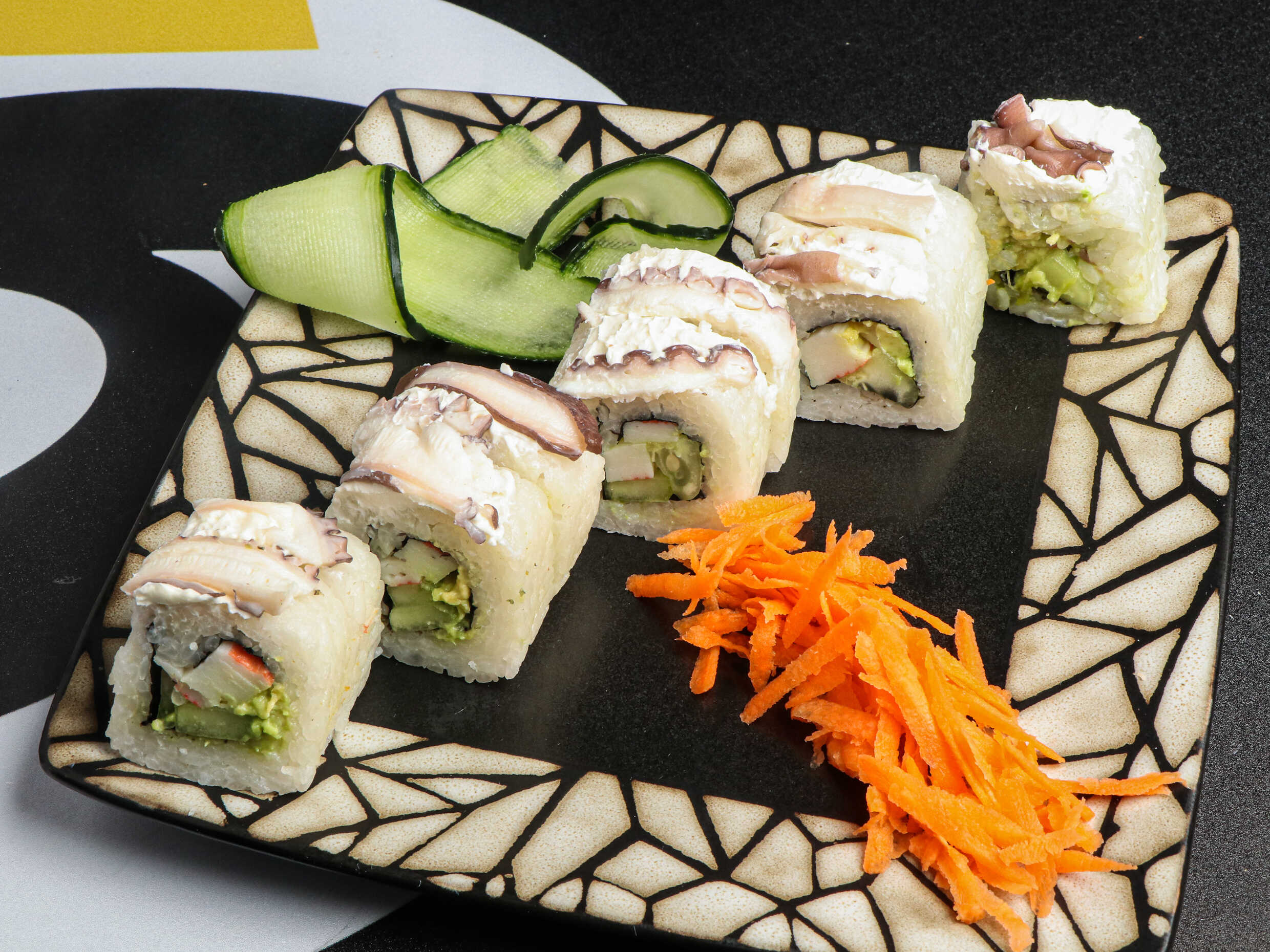 200 gramos de arroz, por dentro pepino, aguacate y surimi de cangrejo, por fuera queso filadelfia y pulpo