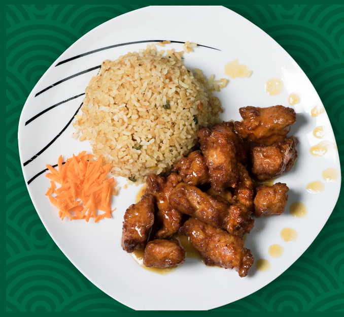 Cubos de pechuga de pollo, pimiento morrón y cebolla, cocidos a la plancha y sazonados con una exquisita salsa teriyaki y ajonjolí