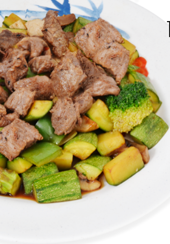 Calabaza, zanahoria, cebolla, pimiento morrón, brócoli, coliflor y col morada cocidos a la plancha, sazonados con soja, vino blanco y 150 gramos de arrachera marinada