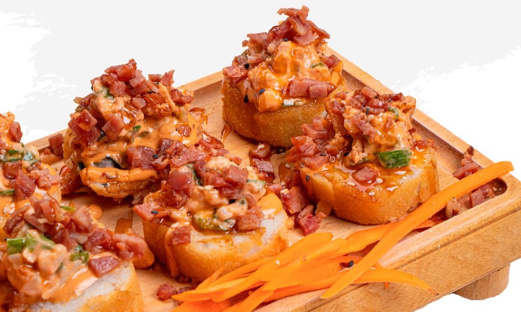 200 gramos de arroz, por dentro salmón horneado, esparragos, queso filadelfia, pepino y aguacate, por fuera hot crunchy onion, ajonjolí y salsa de mango