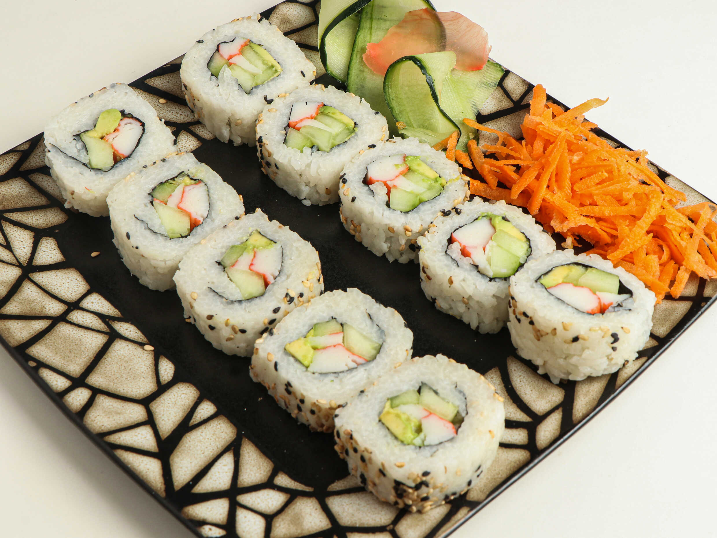 200 gramos de arroz, por dentro pepino, zanahoria y aguacate, por fuera queso filadelfia y surimi de cangrejo