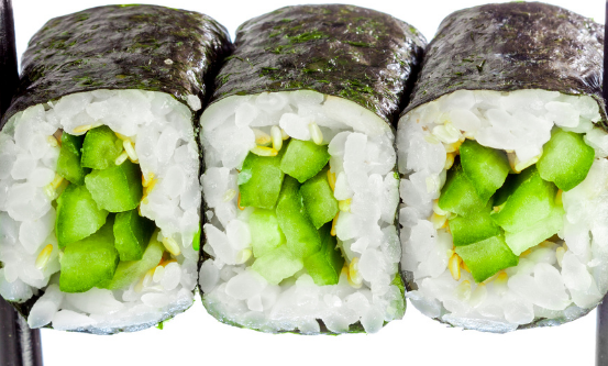 200 gramos de arroz, por dentro camarón, pepino y aguacate, por fuera queso filadelfia
