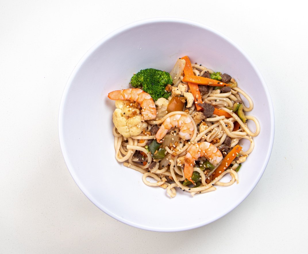 Pasta udon, 60 gramos de camarón, zanahoria, pimiento morrón, cebolla y col morada, sazonados a la plancha con soja y condimentos orientales