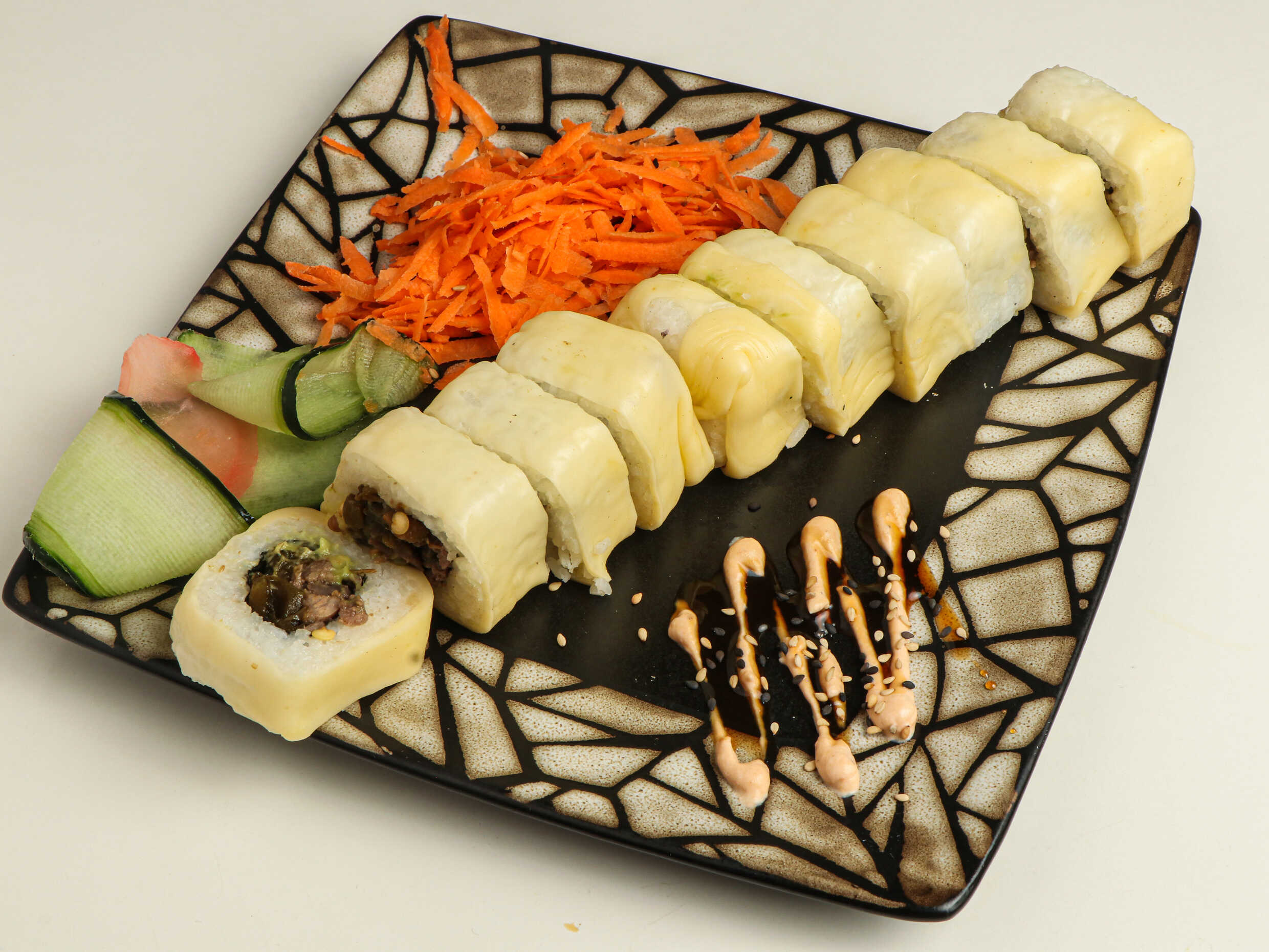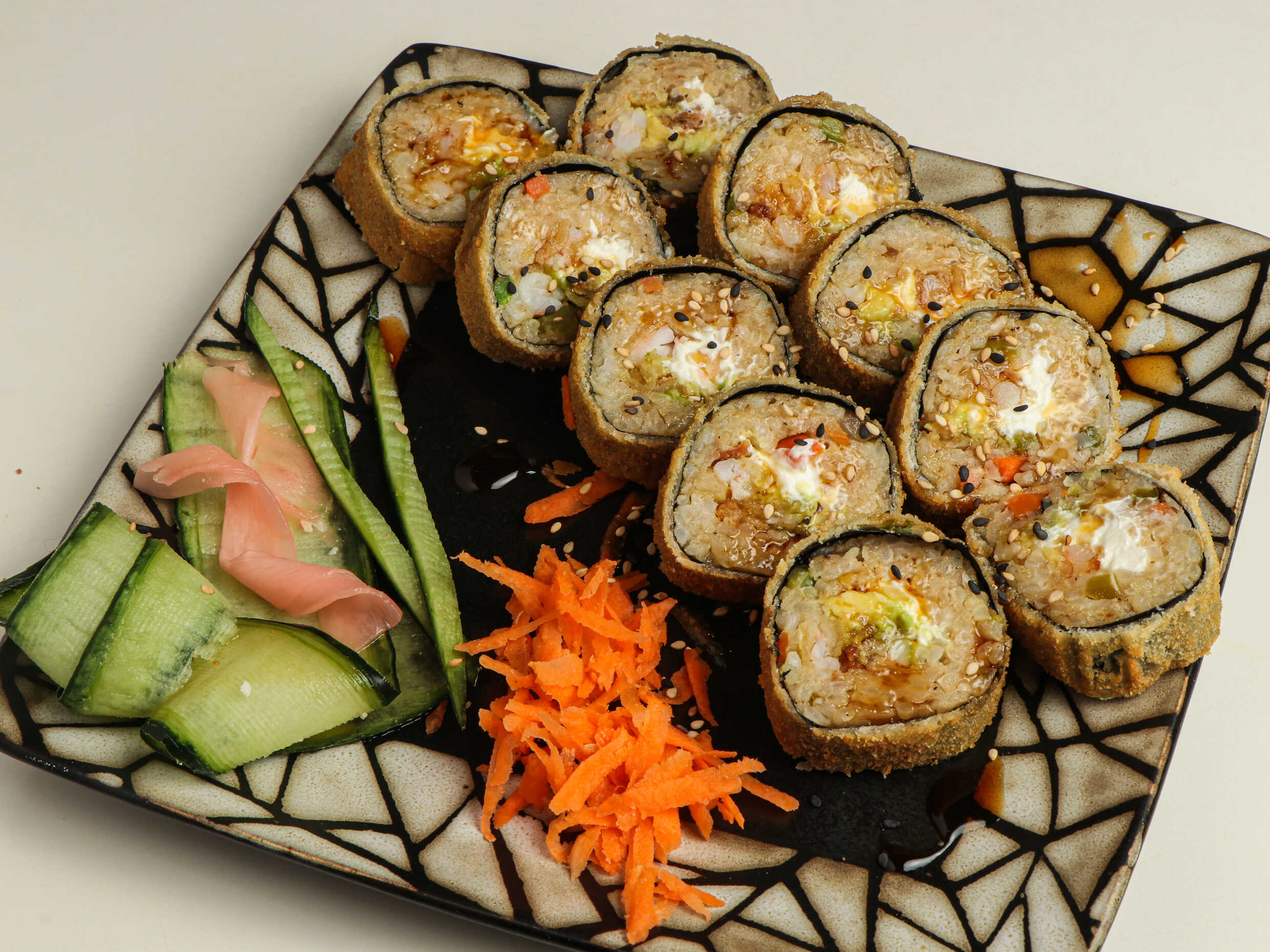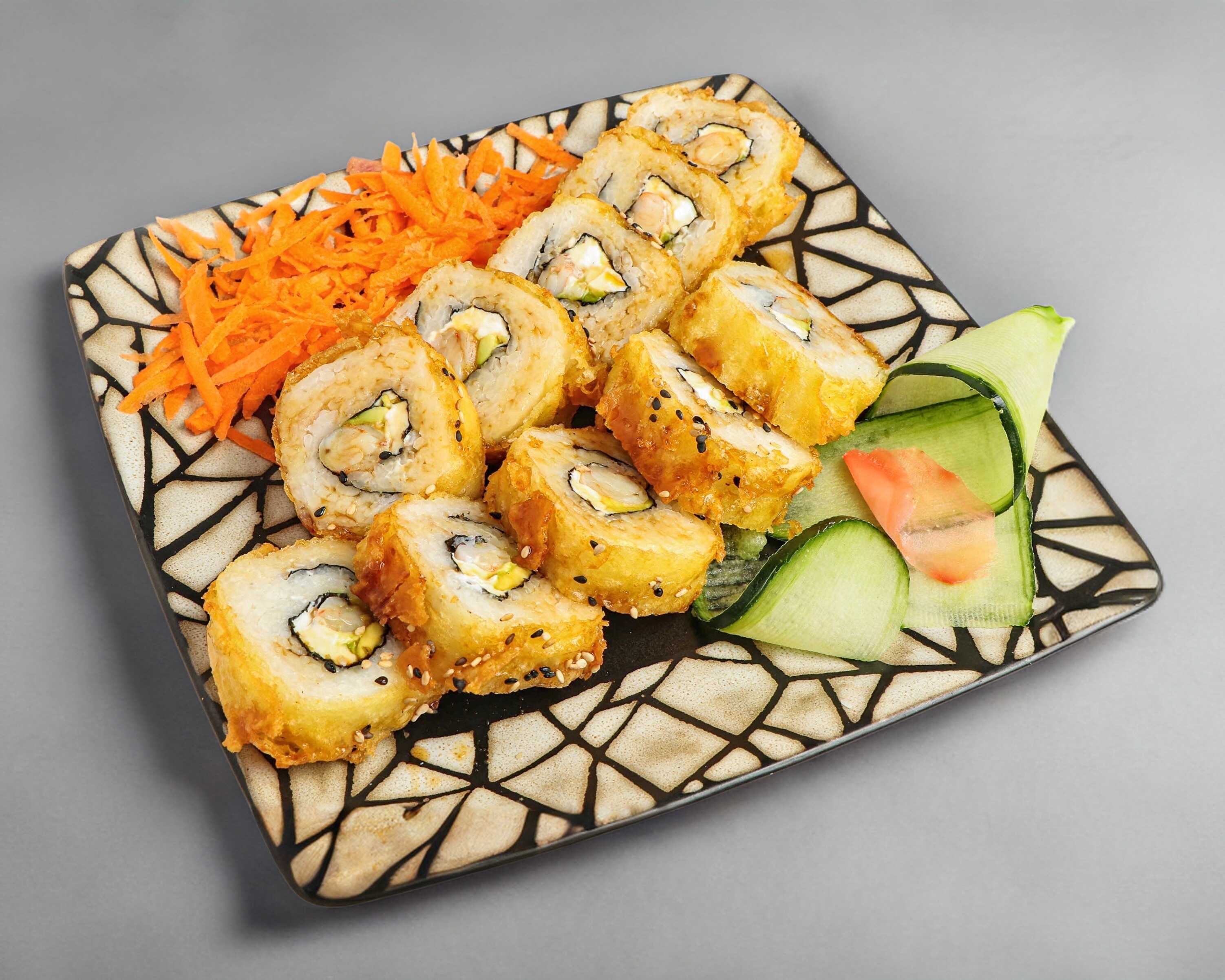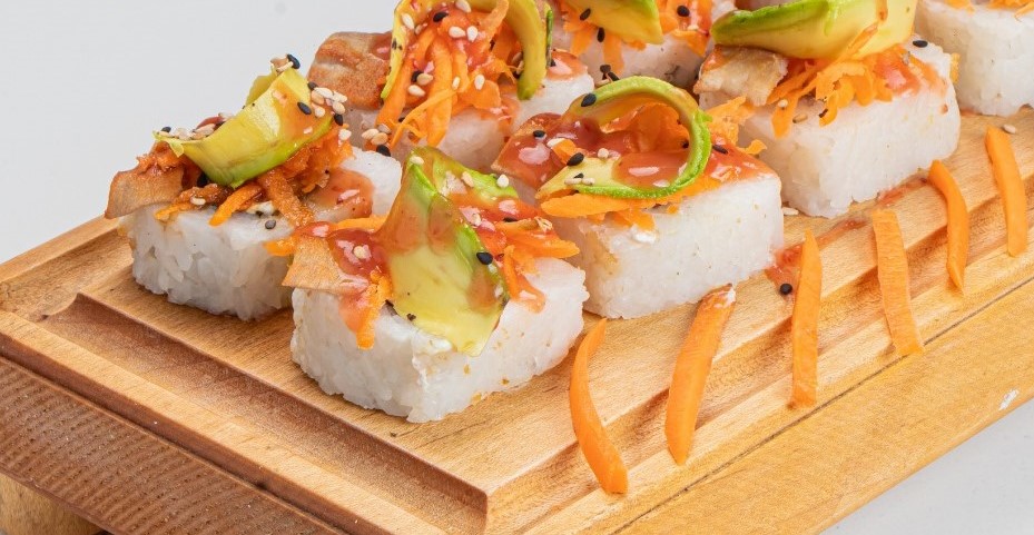 200 gramos de arroz, por dentro queso filadelfia, pepino y aguacate, por fuera ensalada de zanahoria, calabaza tempura, aderezo de cilantro, salsa de mango y ajonjolí