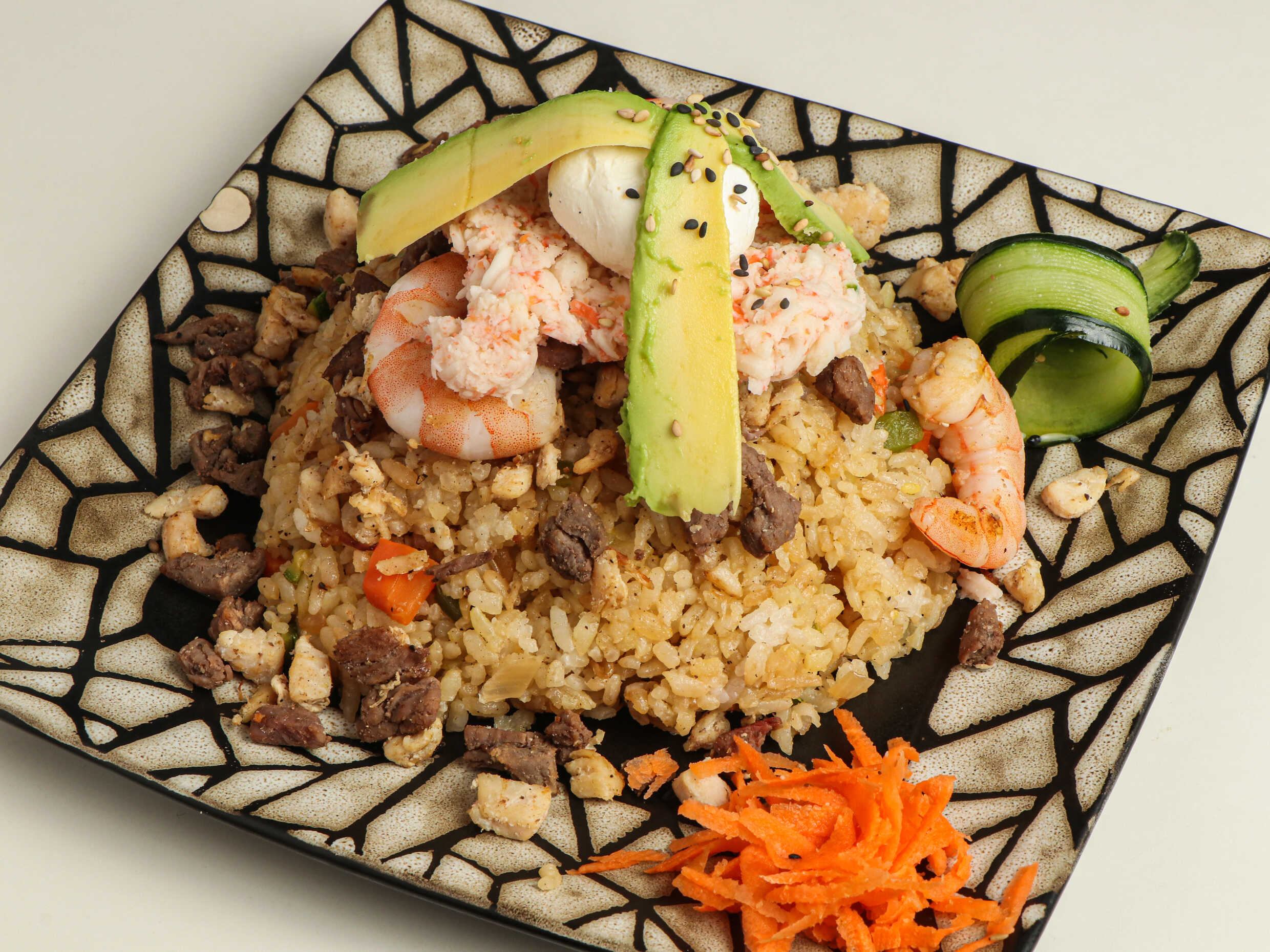 400 gramos de arroz frito a la plancha con cebolla, zanahoria y calabacita, 60 gramos de proteínas, aguacate y queso filadelfia