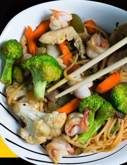Pasta udon, zanahoria, pimiento morrón, cebolla y col morada, sazonados a la plancha con soja y condimentos orientales