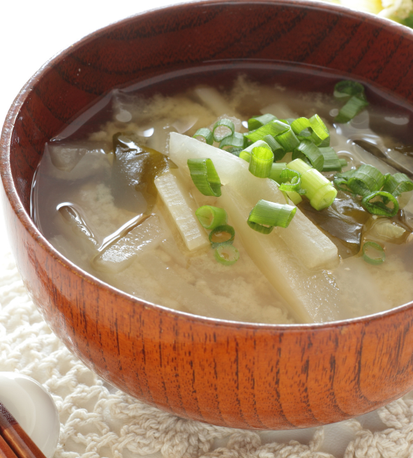 Sopa tradicional oriental, con tofu, pasta misoshiru, champiñon y cebollin, 50 gramos de pollo