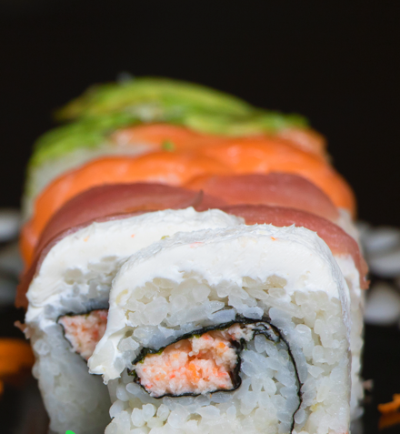 200 gramos de arroz, por dentro surimi de cangrejo, salmón, queso filadelfia y aguacate, por fuera salsa de anguila y ajonjolí
