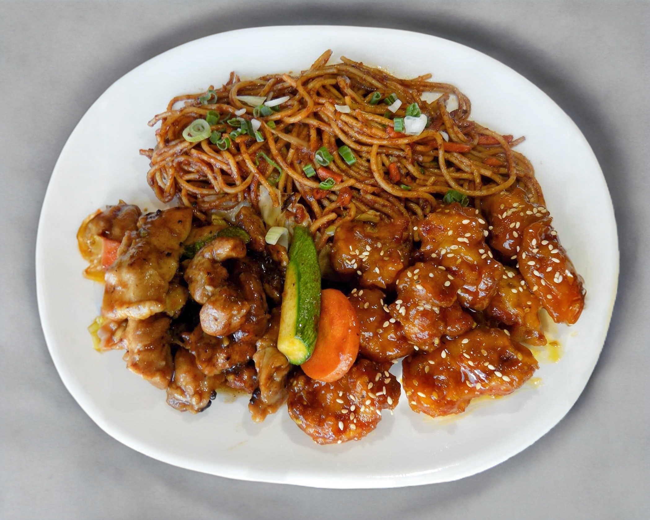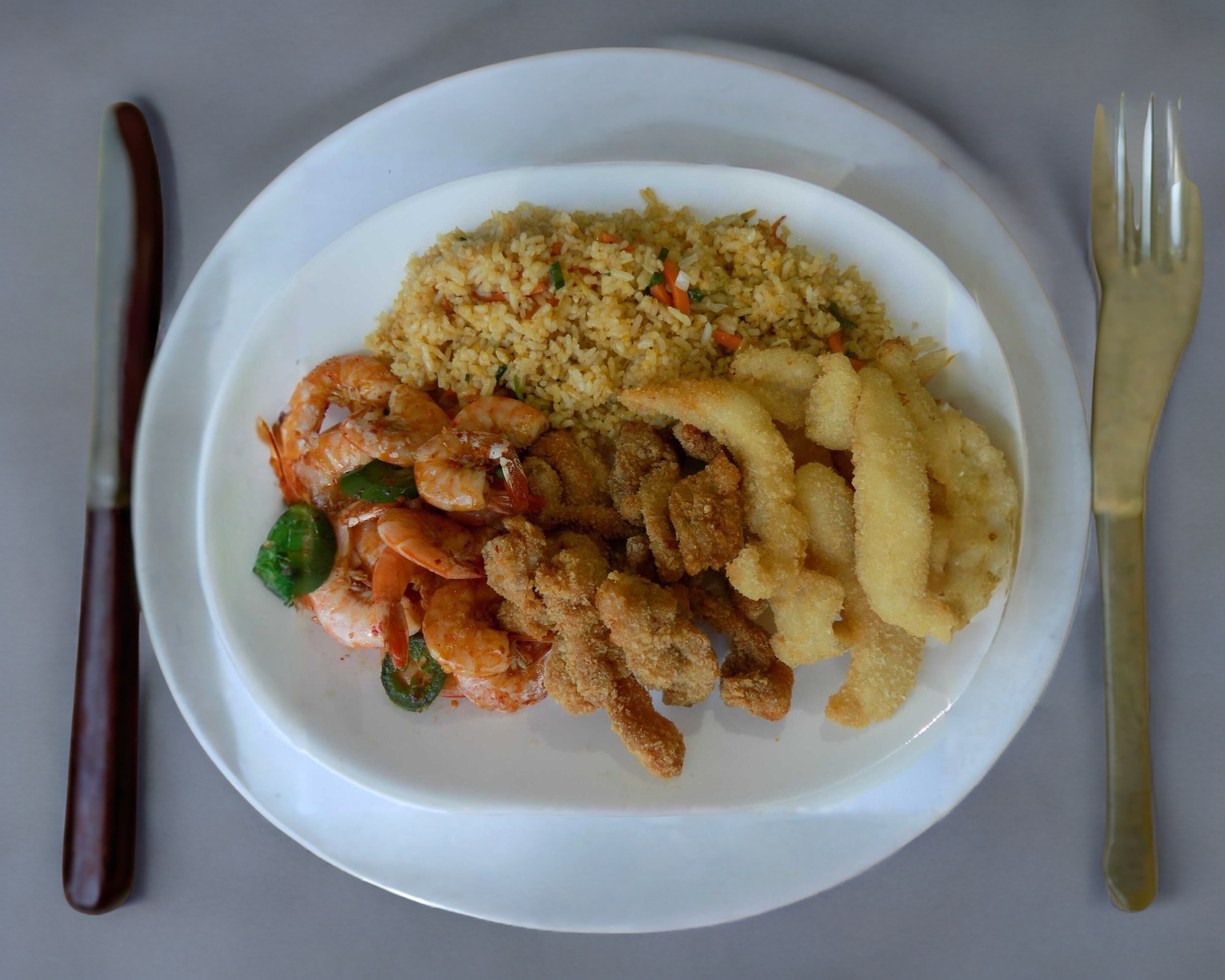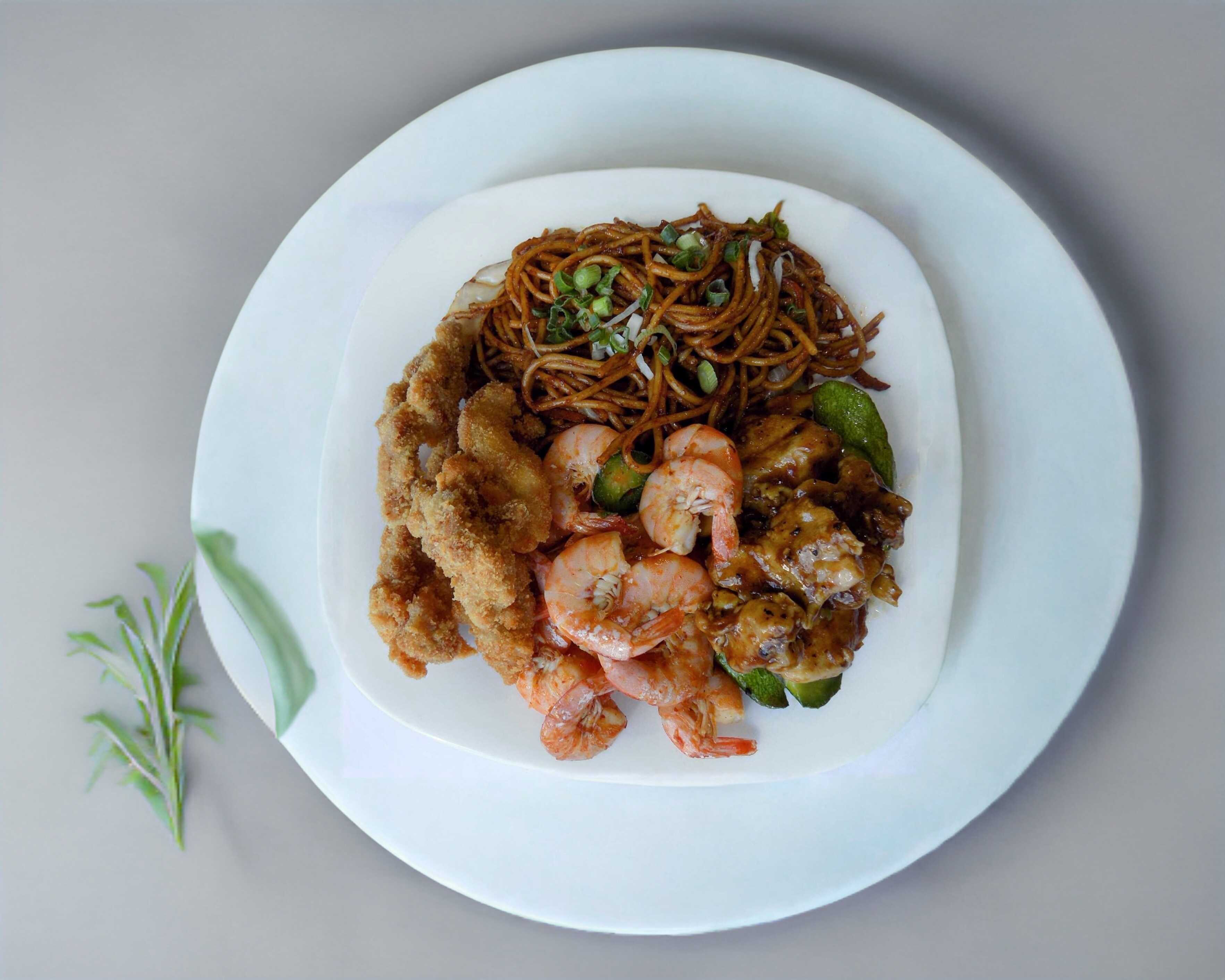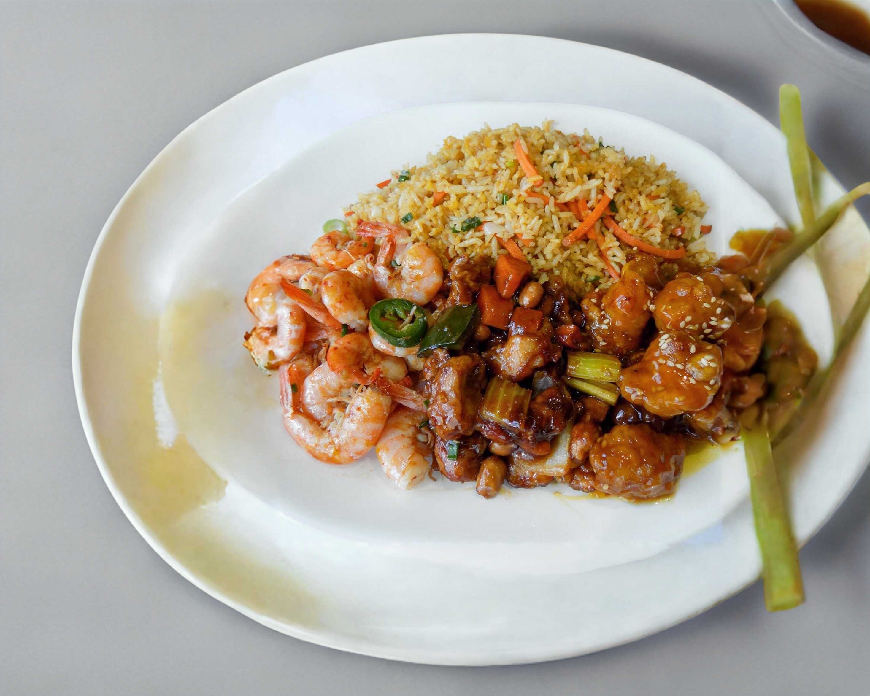 Camaron picosito acompañado de pollo a la naranja y pollo Kung pao