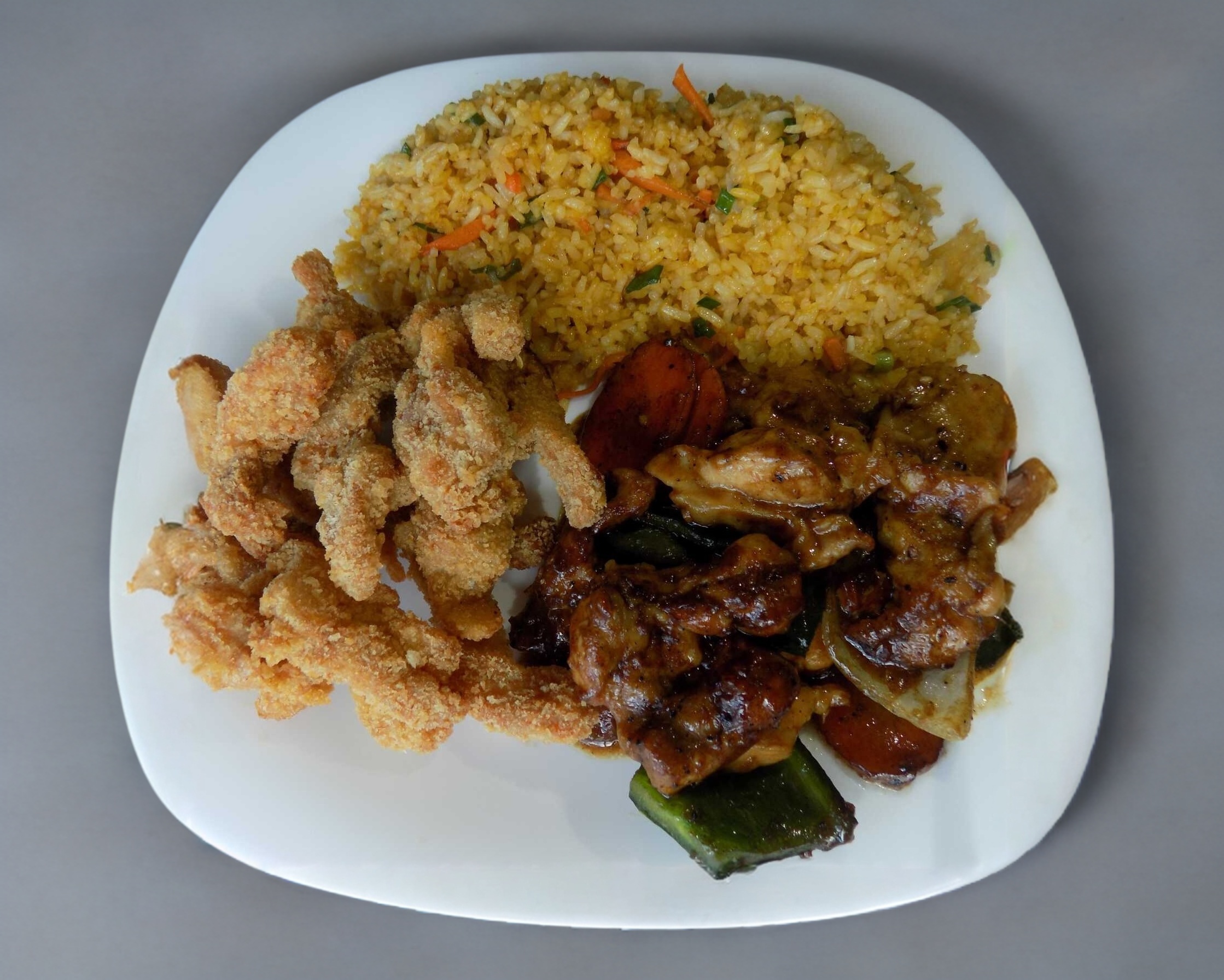 Platillo 3 contiene una porción personal de fajitas de pollo con arroz frito o espaguetis, según elección del cliente; también se puede elegir mixto. Incluye salsa de soya, salsa picante y lleva cubiertos.