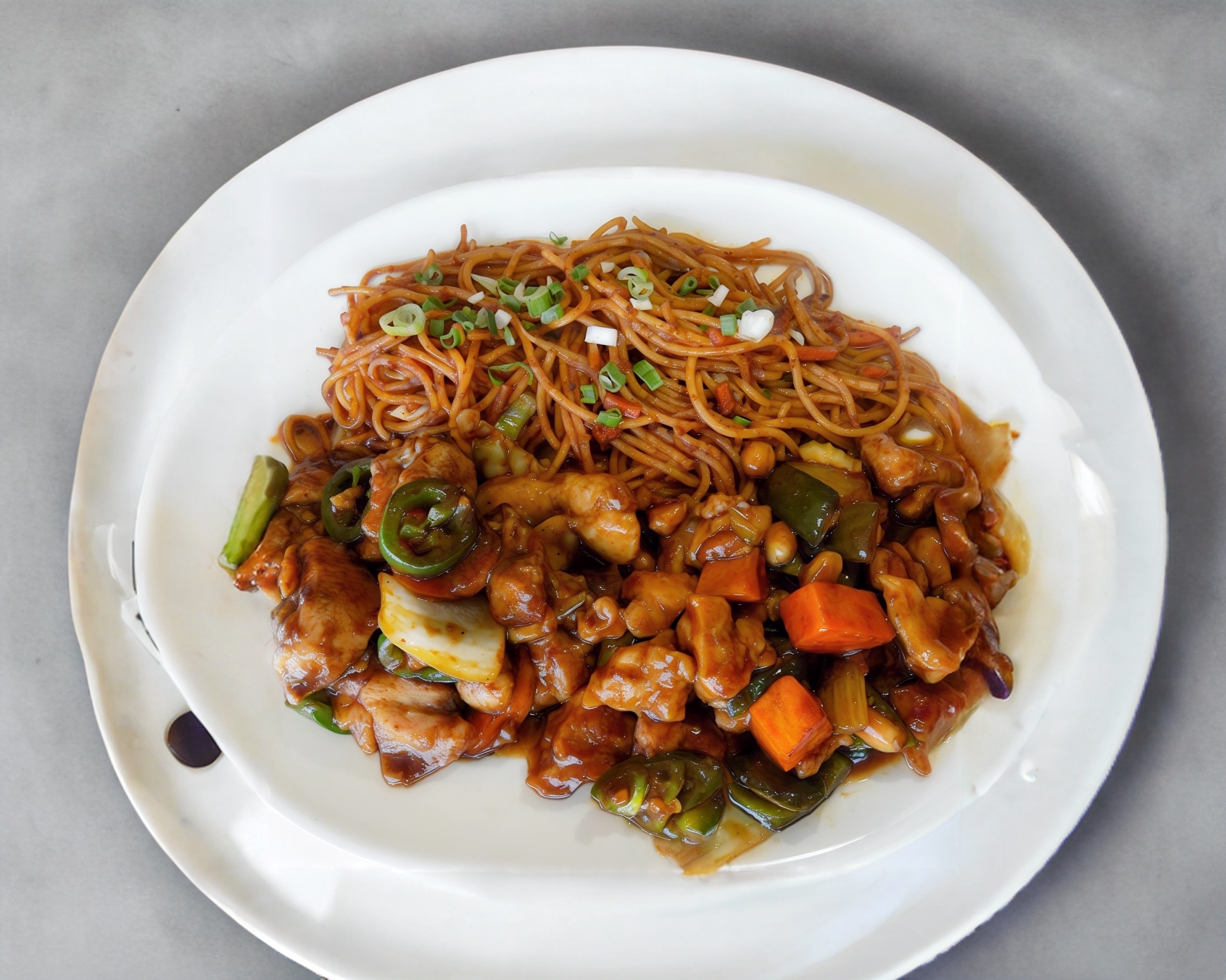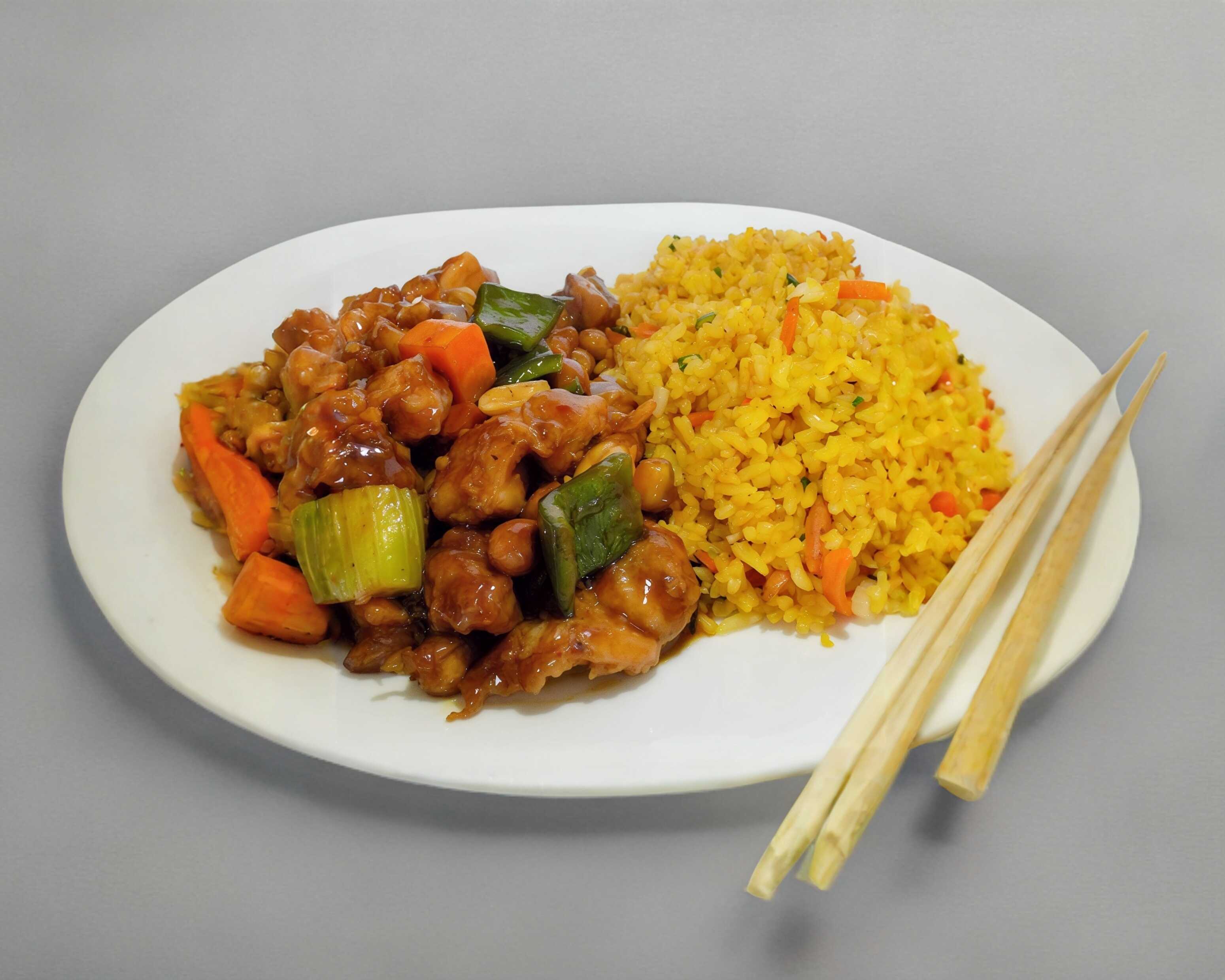 Tradicional pollo Kung Pao, con arroz frito o espaguetis según elección del cliente; también se puede elegir mixto. Incluye salsa de soya, salsa picante y cubiertos.