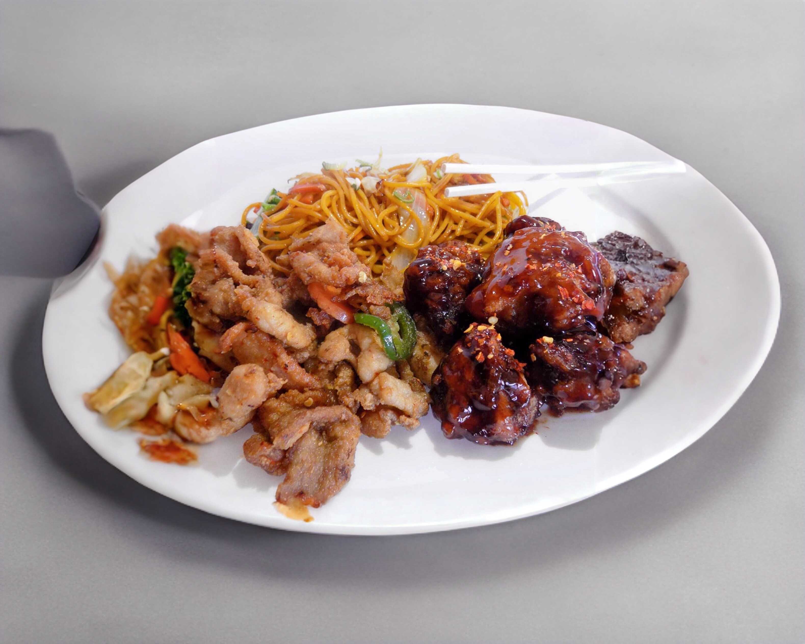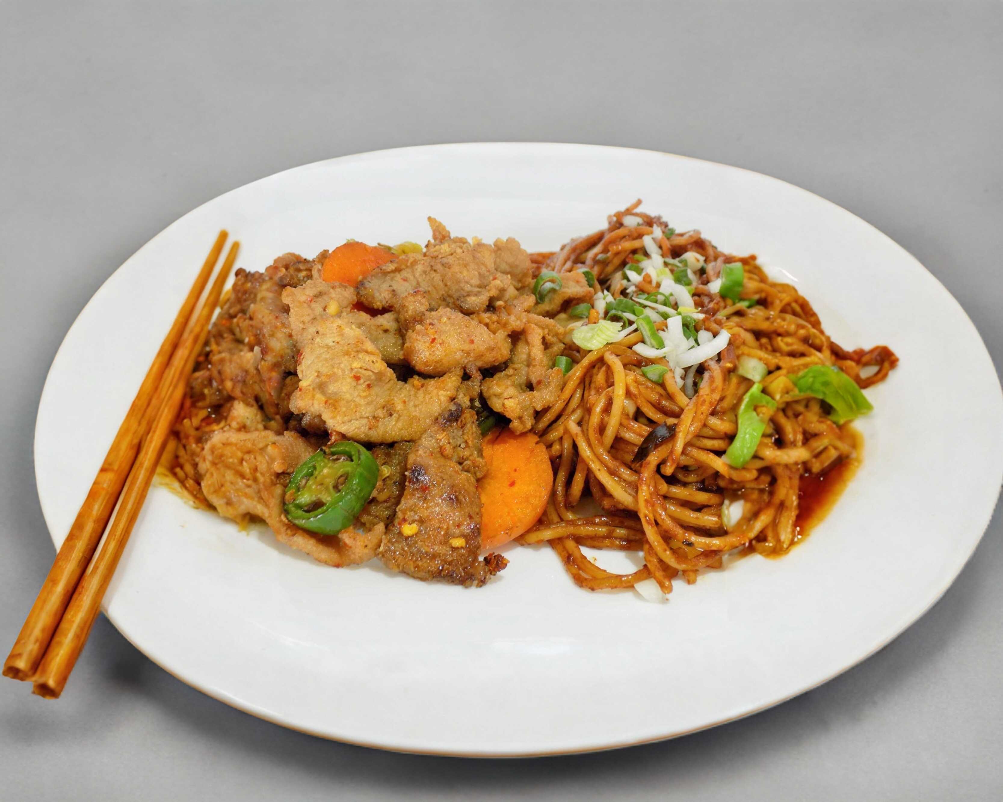 Puntas de puerco enchilado y pollo en salsa mongolia.