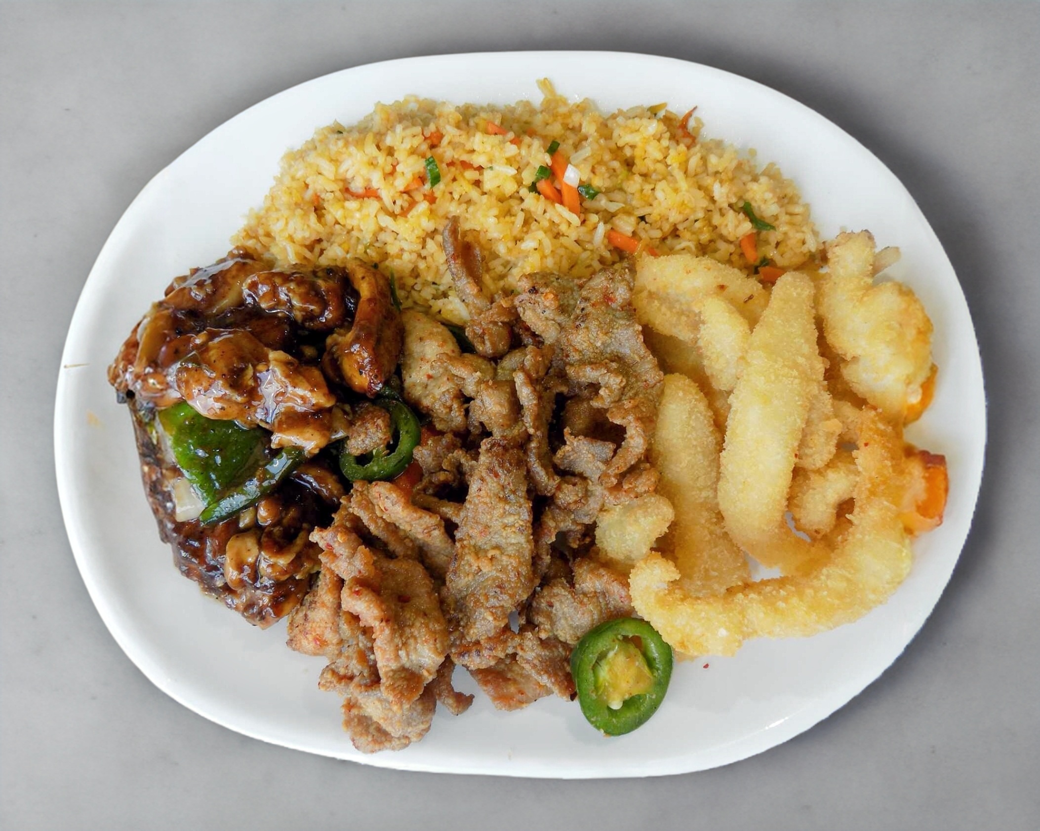 Filete de pescado empanizado, puntas de puerco enchilado y pollo en salsa pimienta.