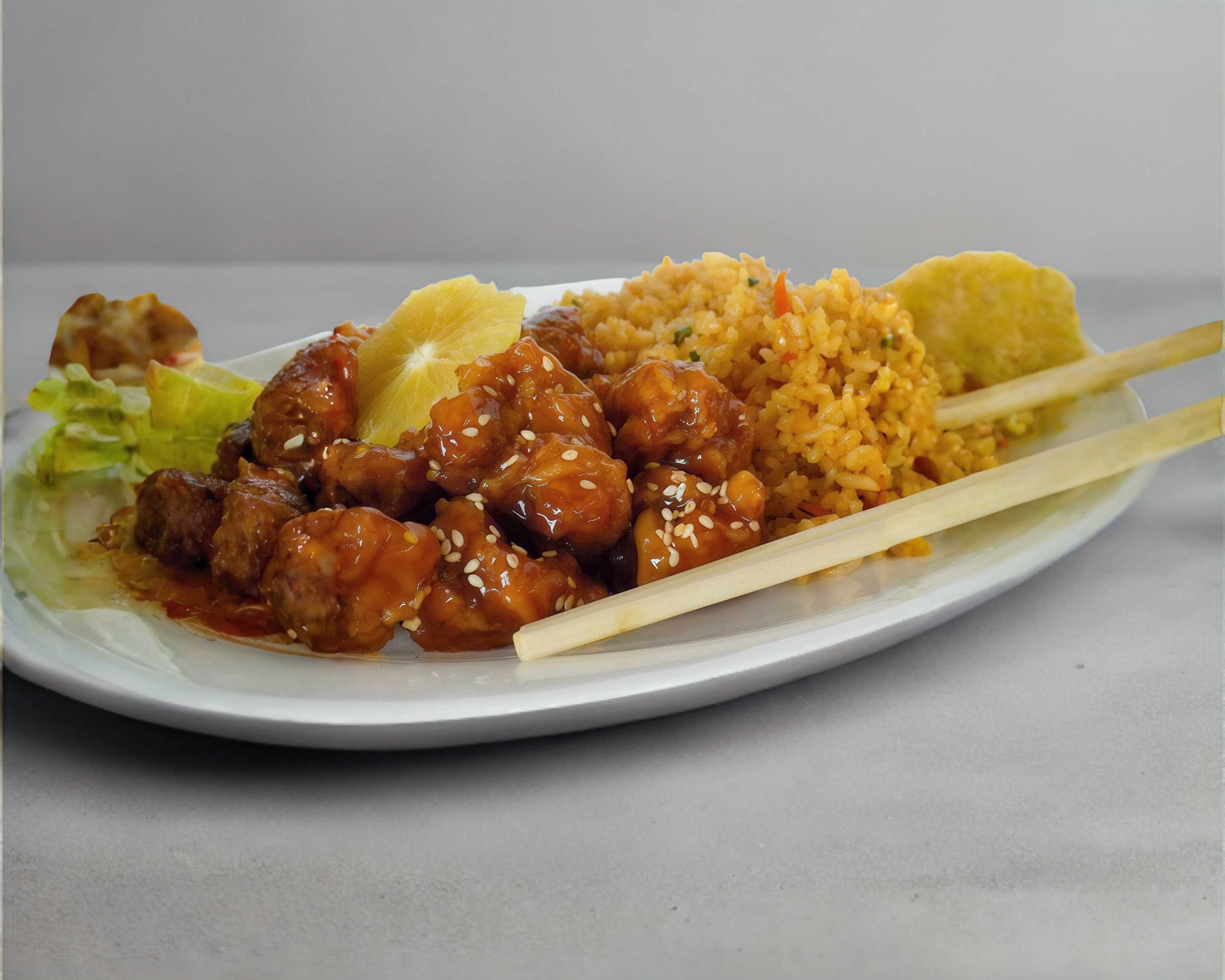Tradicional pollo a la naranja.