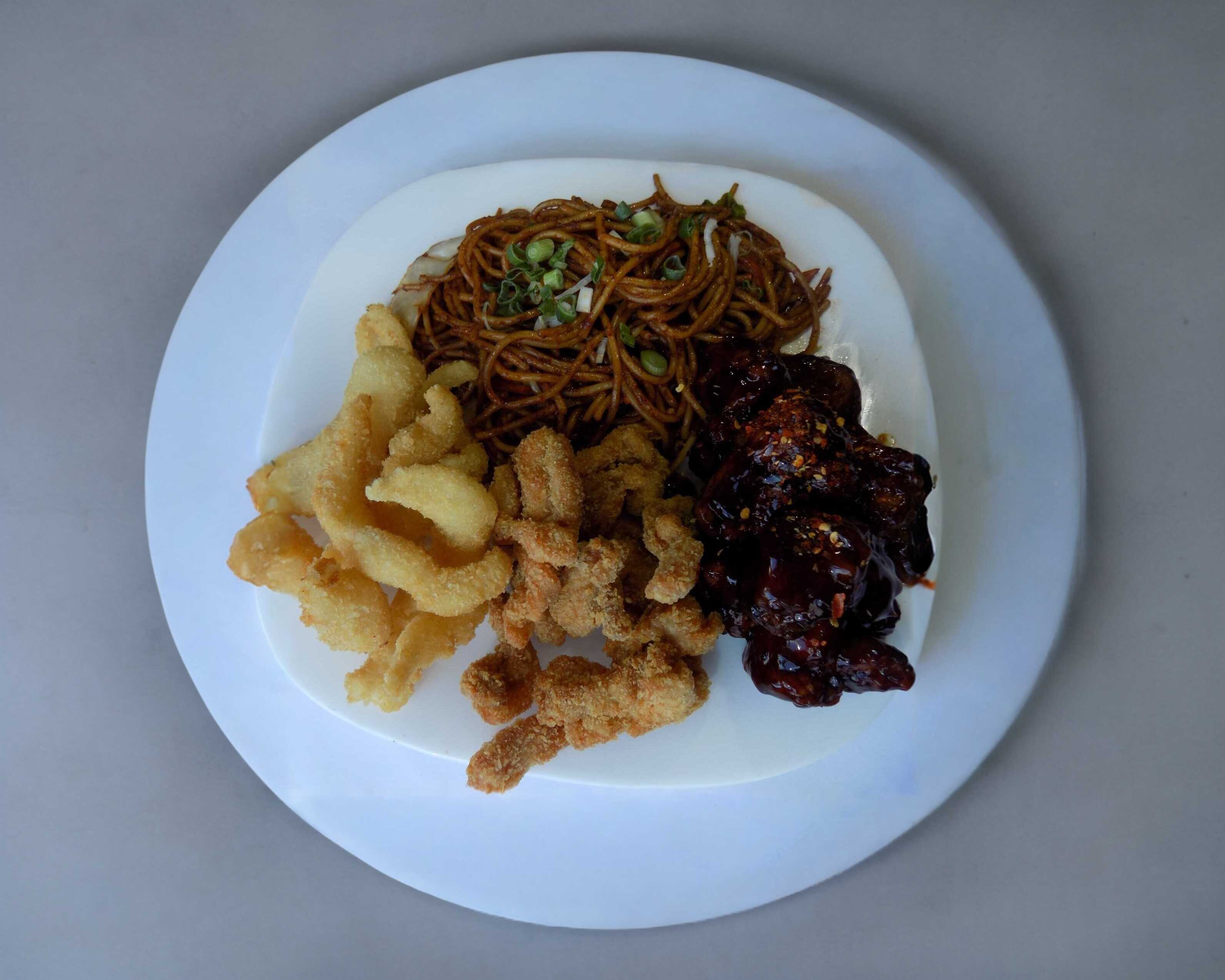 Filete de pescado empanizado, pollo empanizado y pollo mongolia