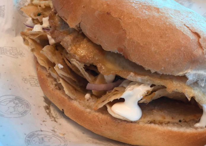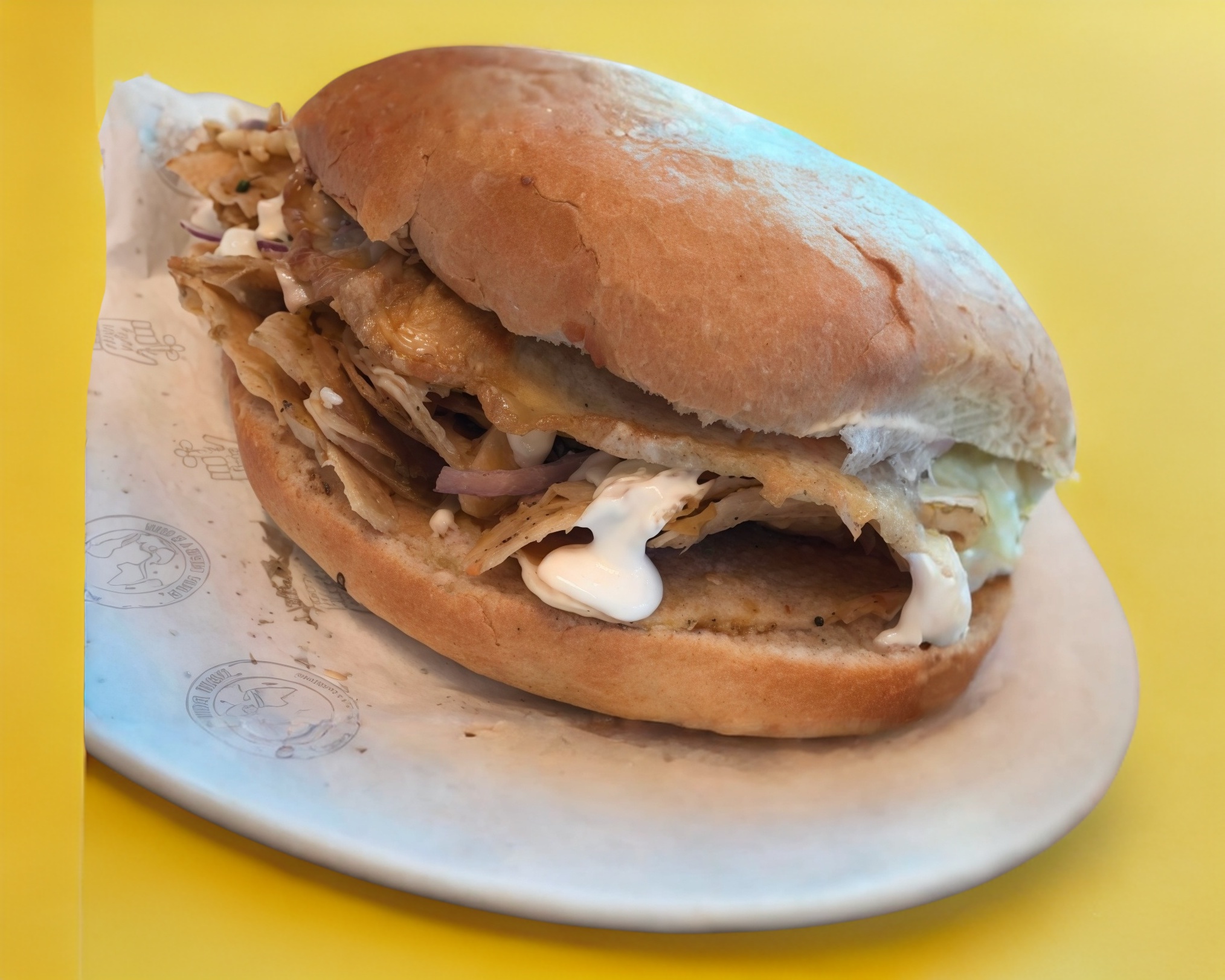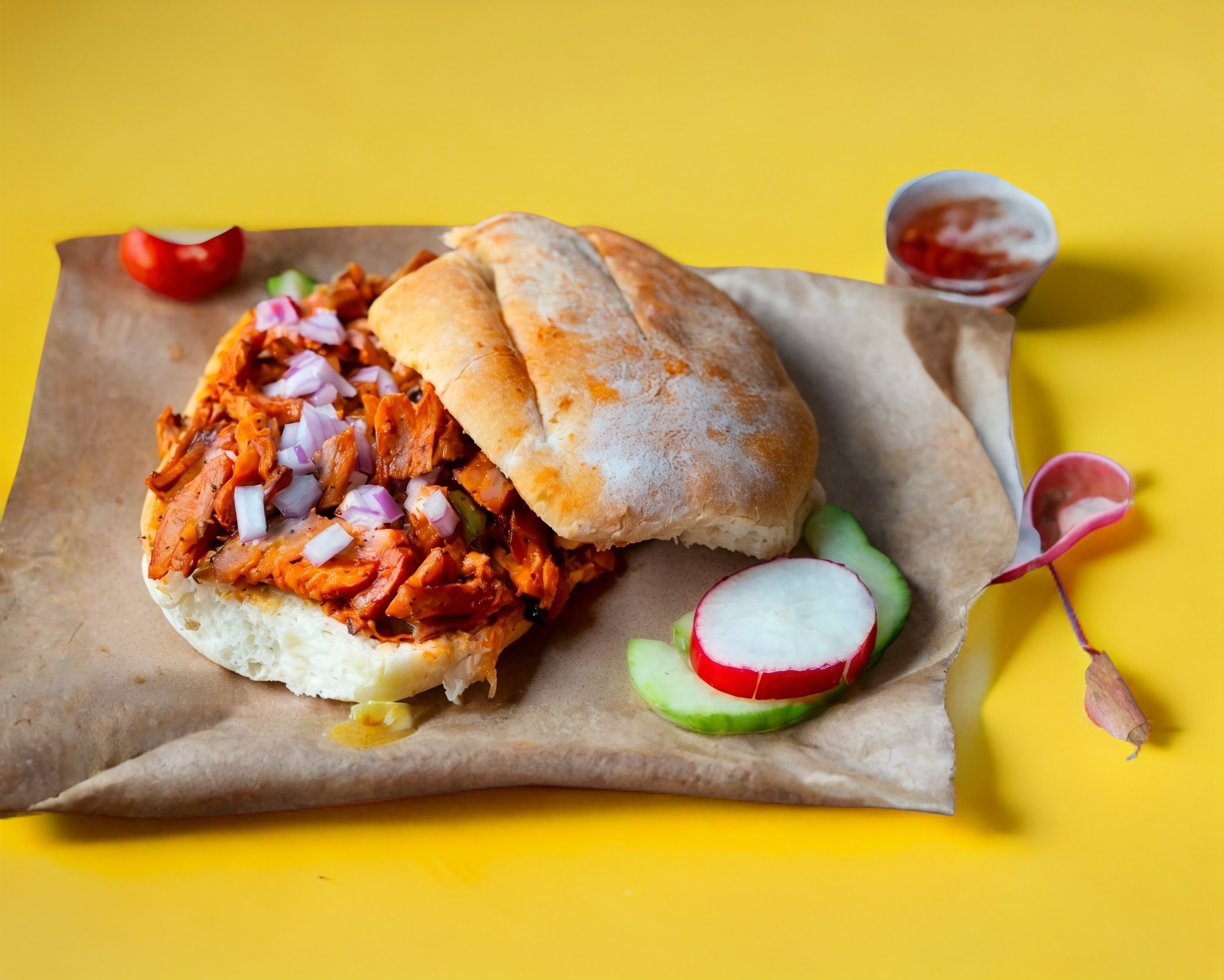 Pan relleno con carne al pastor, queso americano amarillo, aguacate, tomate.