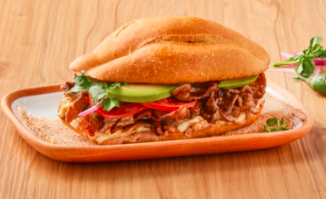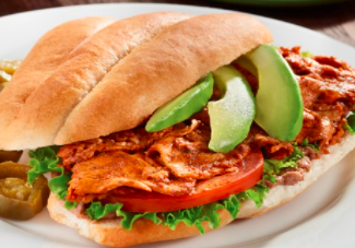 Pan relleno de carne deshebrada y 4 rebanadas de aguacate con chile.