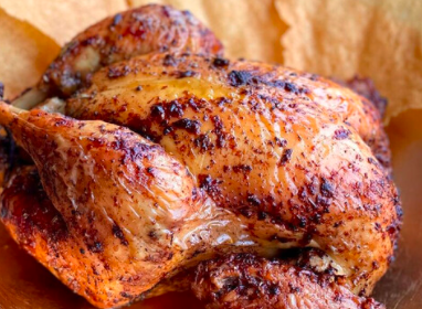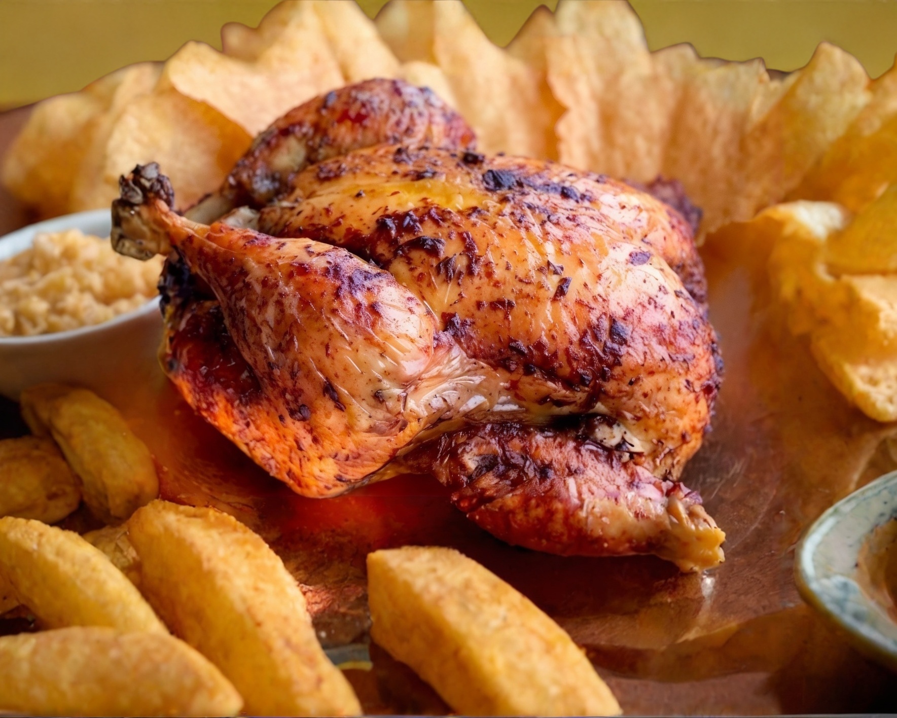 1 Pollo asado entero, acompañado con 1/2 orden de arroz rojo, 4 onzas de salsas.