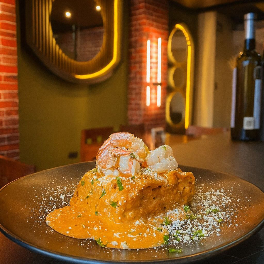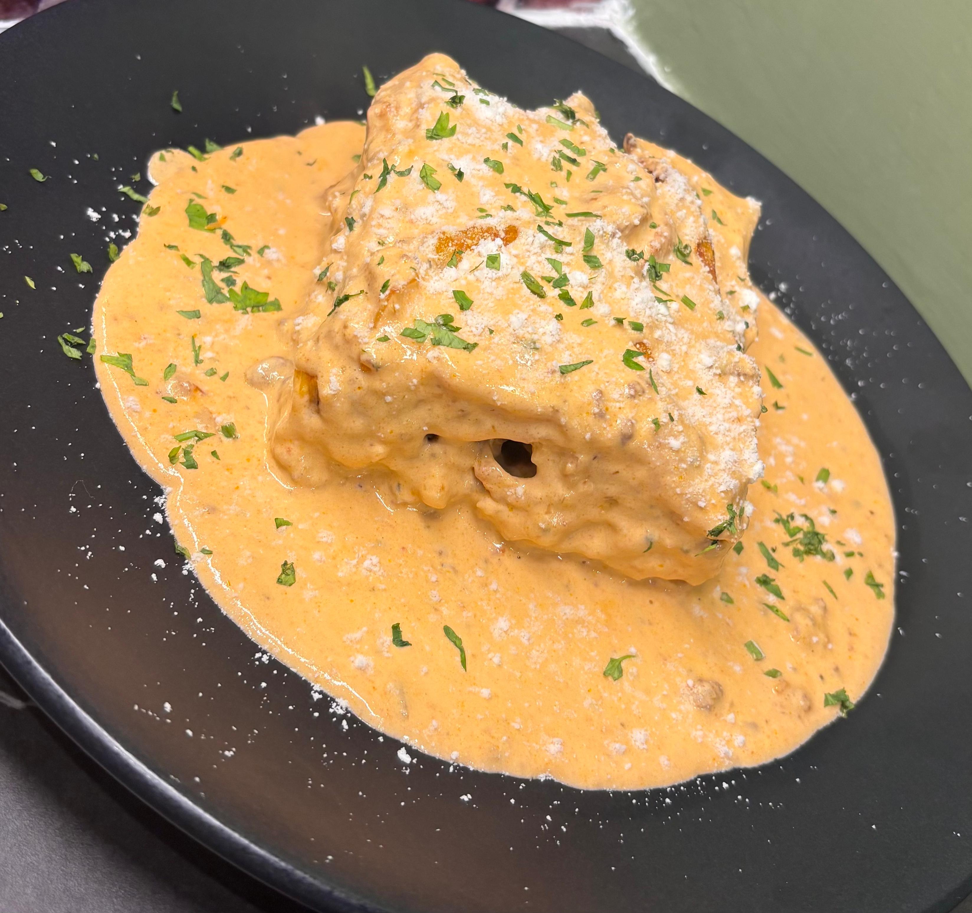LASAÑA TRADICIONAL DE CARNA CON CAMARONES AL AJILLO