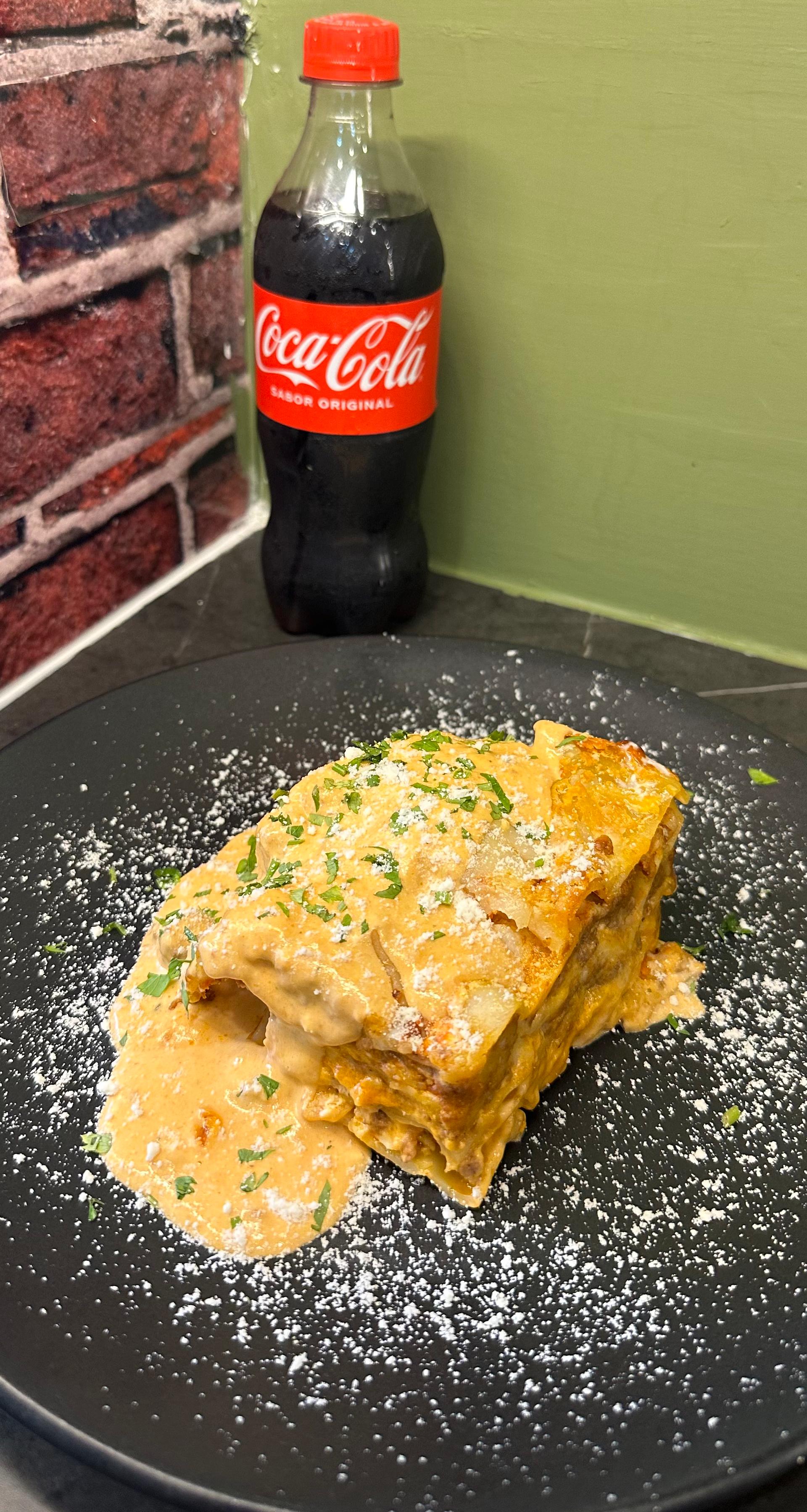 Laminas de pasta con estofado de res y puerco en salsa blanca y tomate con queso mozzarela y parmesano.