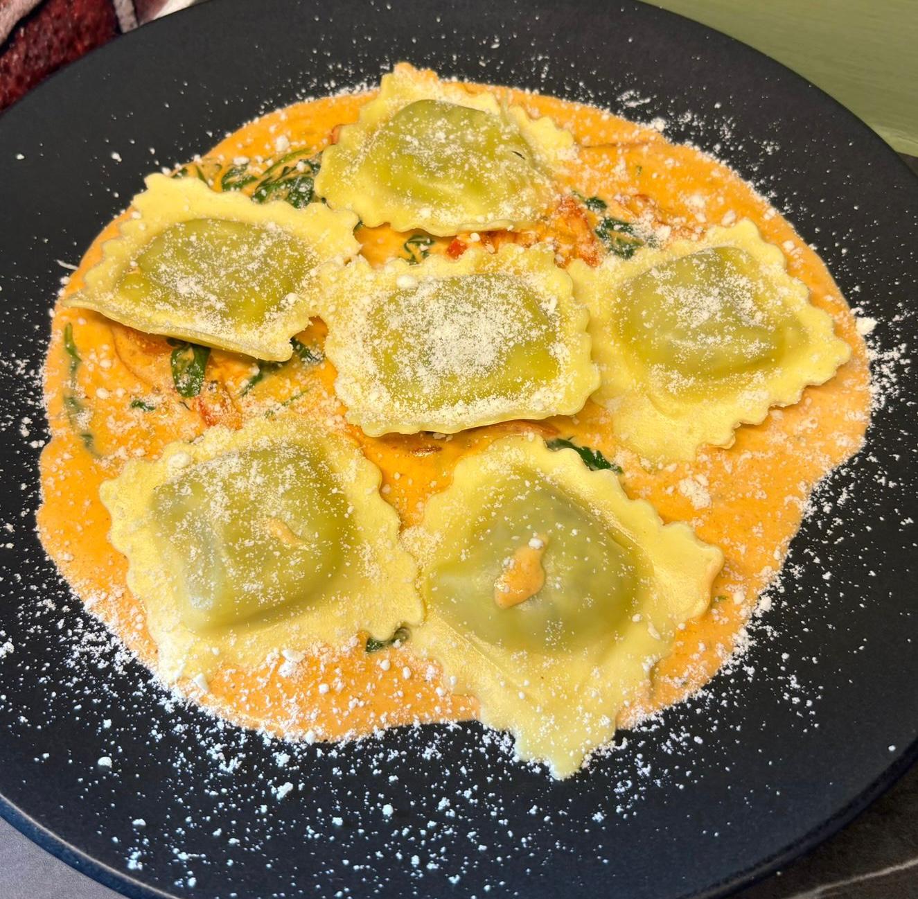 Combo 4 ravioli de queso ricotta y espinaca salsa rosa ( tomate y alfredo) con pimientos y espinaca y San Pellegrino.