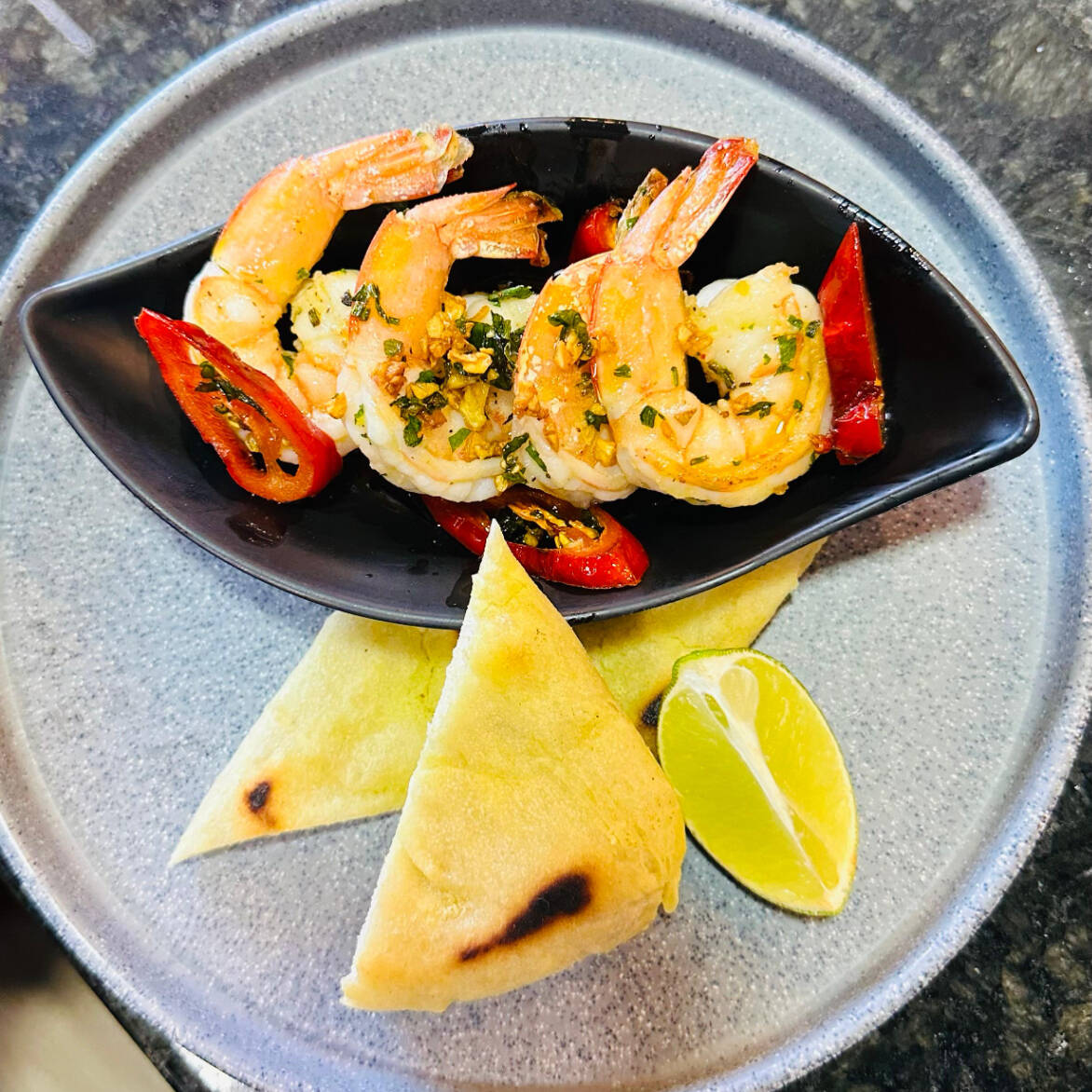 4 CAMARONES GIGANTES COCINADOS CON AJO FRESCO ,ACEITE DE OLIVA ,PEREJIL FRESCO , VINO BLANCO CHILE JALAPEÑO ROJO CON UNA RODAJA DE PAN AL HORNO