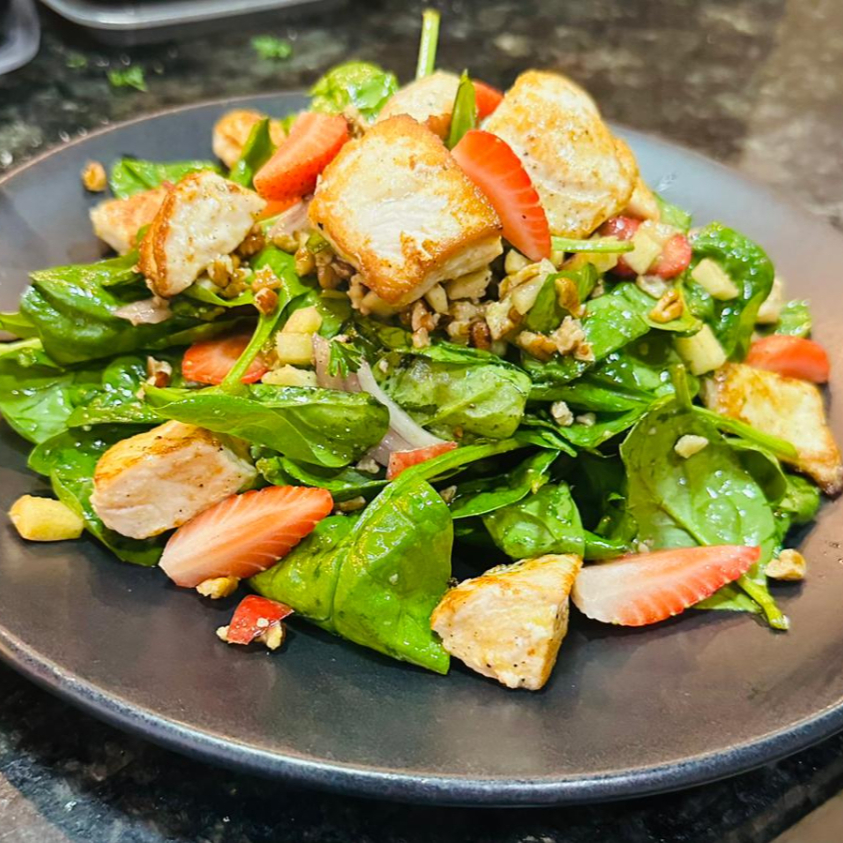 ESPINACA POLLO , FRESA,MANZANA, NUEZ, POLLO Y ADEREZO BALSAMICO