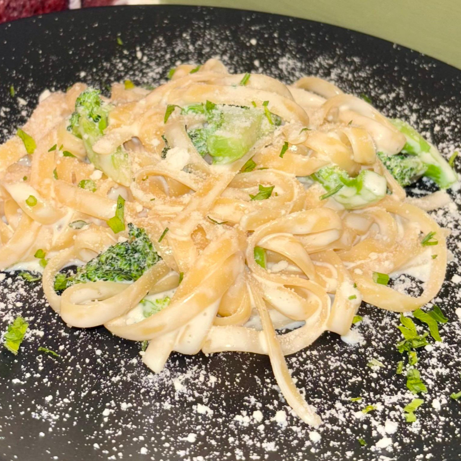 Pasta fettuccine en salsa alfredo con brocoli y pollo queso parmesano.