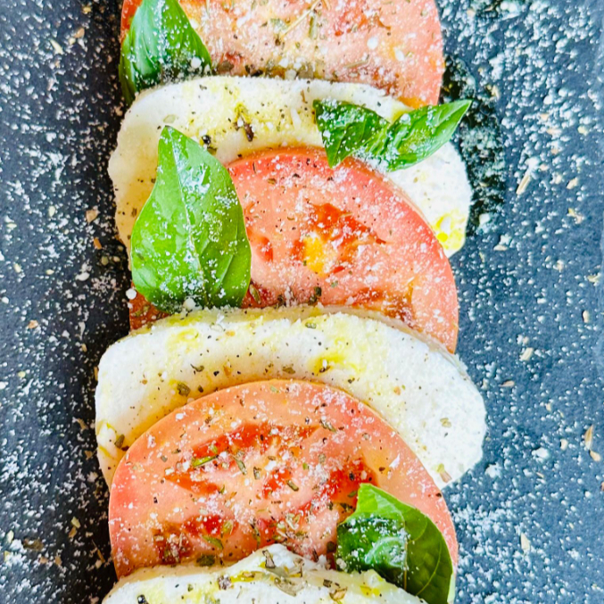 RODAJAS DE TOMATE FRESCO.QUESO MOZZARELA FRESCO,ALBAHACA FRESCA ,OREGANO Y QUESO PARMESANO