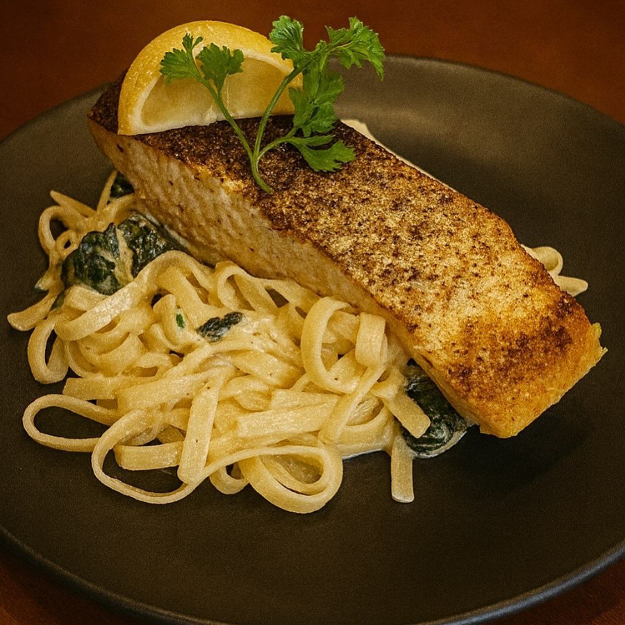 SALMON AL HORNO CON PASTA ALFREDO CON ESPINACA Y PIMIENTOS