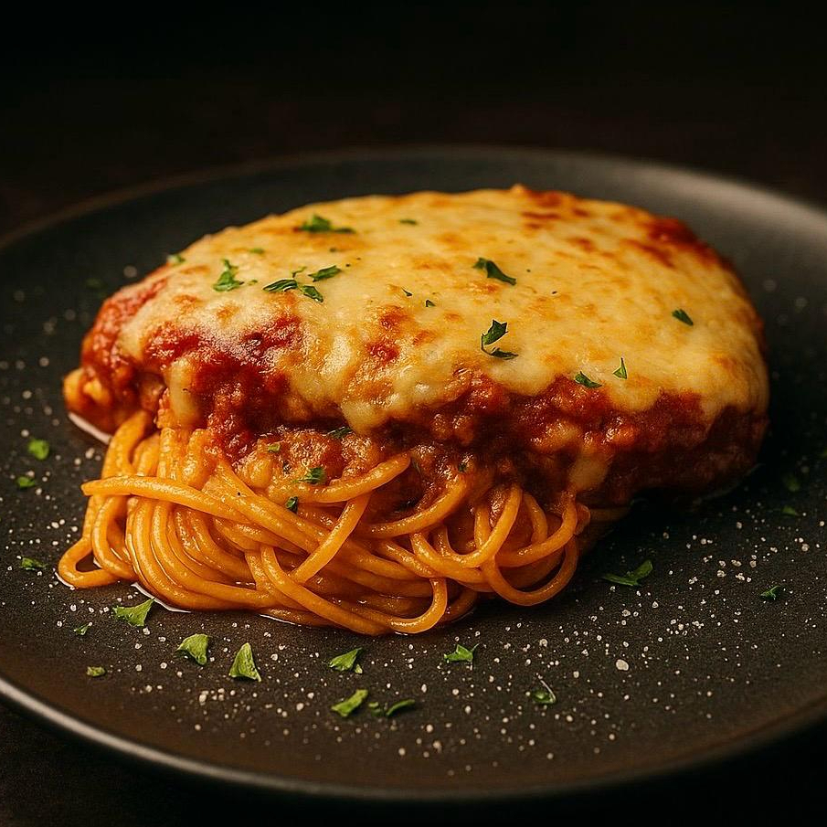 PECHUGA DE POLLO EMPANIZDA CON SALSA DE TOMATE Y GRATINADA CON MOZZARELA Y ESPAGUETTI