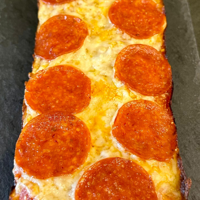 pizza individual rectangular de 25 cm con salsa de tomate ,queso mozzarela , parmesano y peperoni fresco