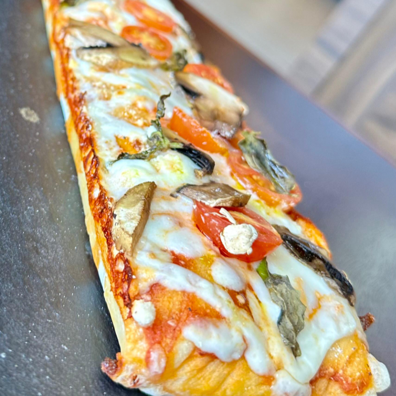 Pizza indivudual rectangular de 25 cm con salsa fresca de tomate ,queso mozzarela ,parmesano ,tomate cherry,champiñones y albahaca fresca