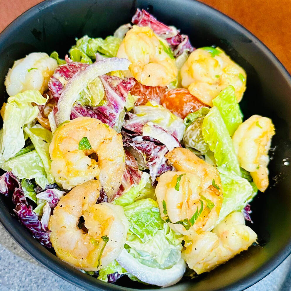 MIX DE LECHUGA CON TOMATE CHERRY ,CEBOLLA MORADA,OLIVAS ,CAMARONES DE LA CASA Y ADEREZO DE LA CASA