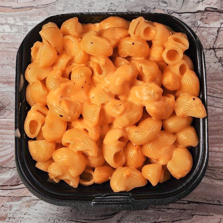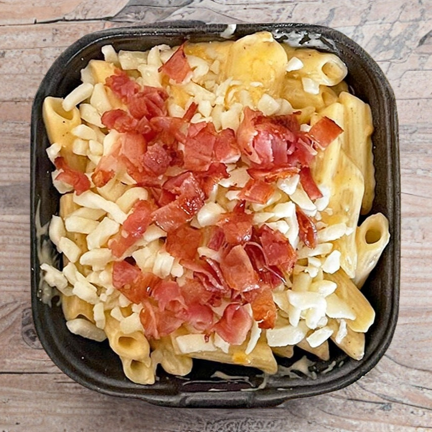 Nuestra salsa Cheese Mac coronada con Tocino y queso Mozzarrella encima