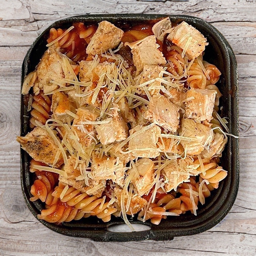 Nuestra salsa Pomodoro salteada con Champiñones y coronada con doble porción de Pechuga de Pollo con queso Parmesano encima