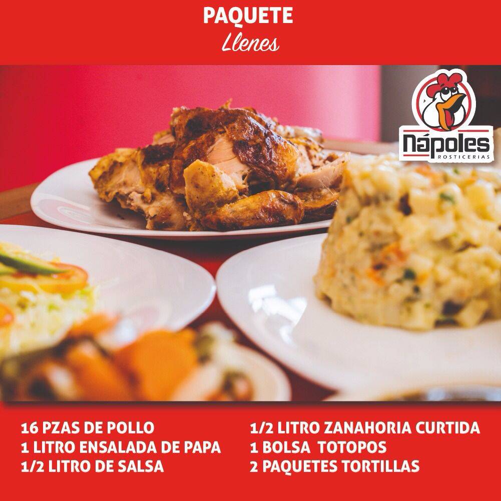 Incluye 16 piezas de pollo, 1 litro de ensalada de papa, 1/2 litro de salsa, 1/2 litro de zanahorias curtidas 1 Bolsa de totopos y 2 paquetes de tortillas