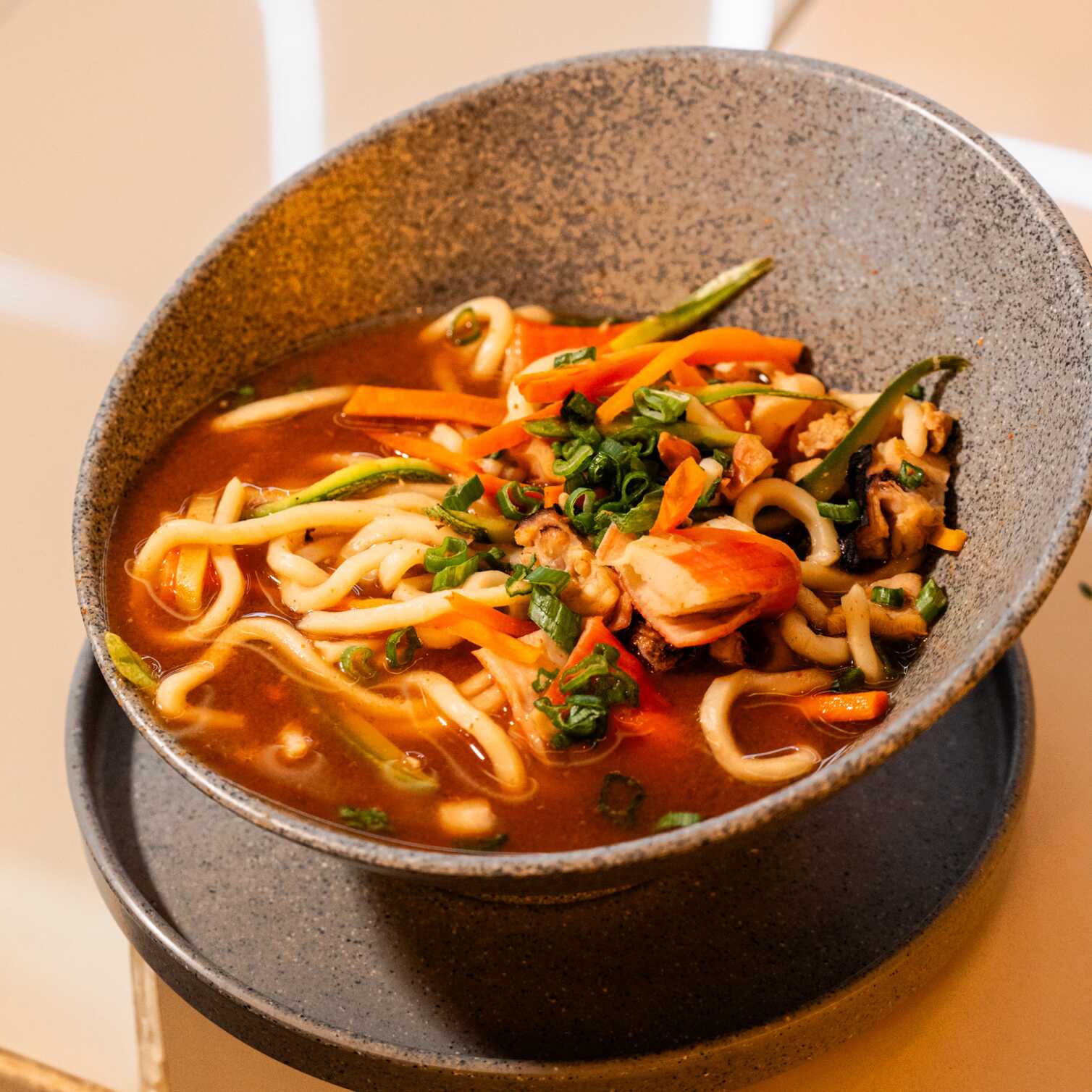 Deliciosa pasta de udon acompañada de pulpo, callo, camarón asi como vegetales (zanahoria y calabaza) con mezcla de chiles. (Picante a elegir).