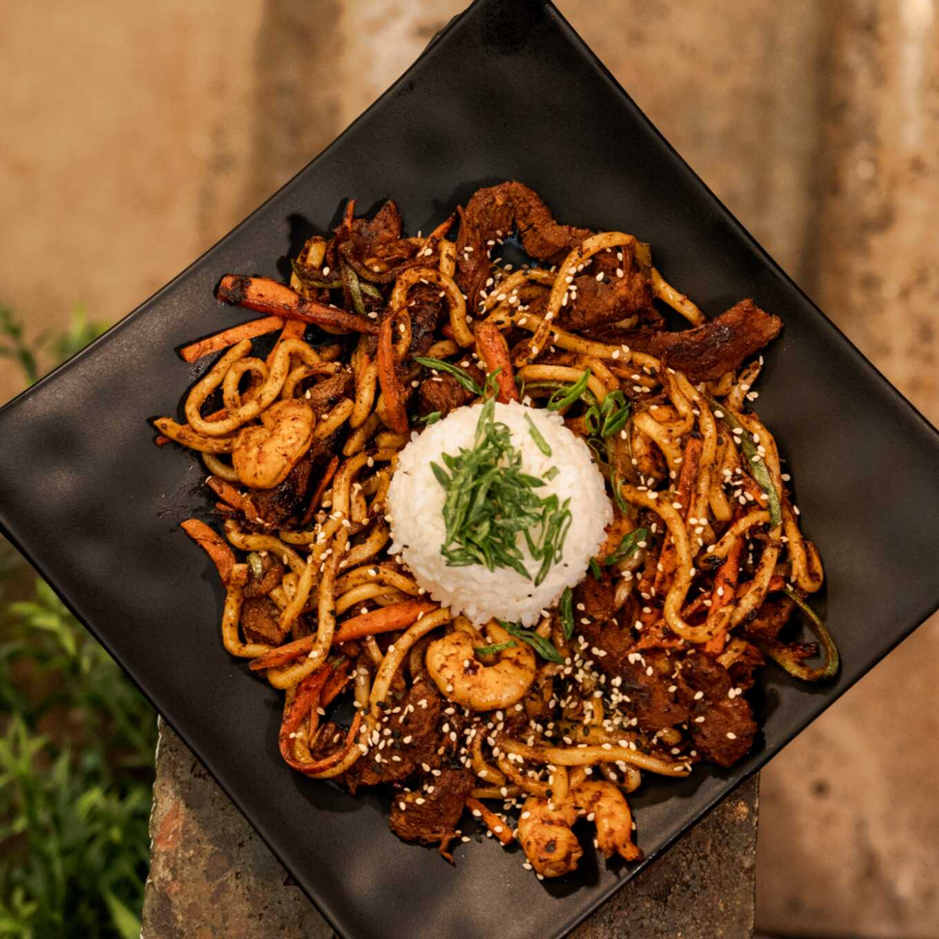 Riquísima pasta de udon a la plancha servida en cama de arroz con vegetales, camarones y ajonjolí.