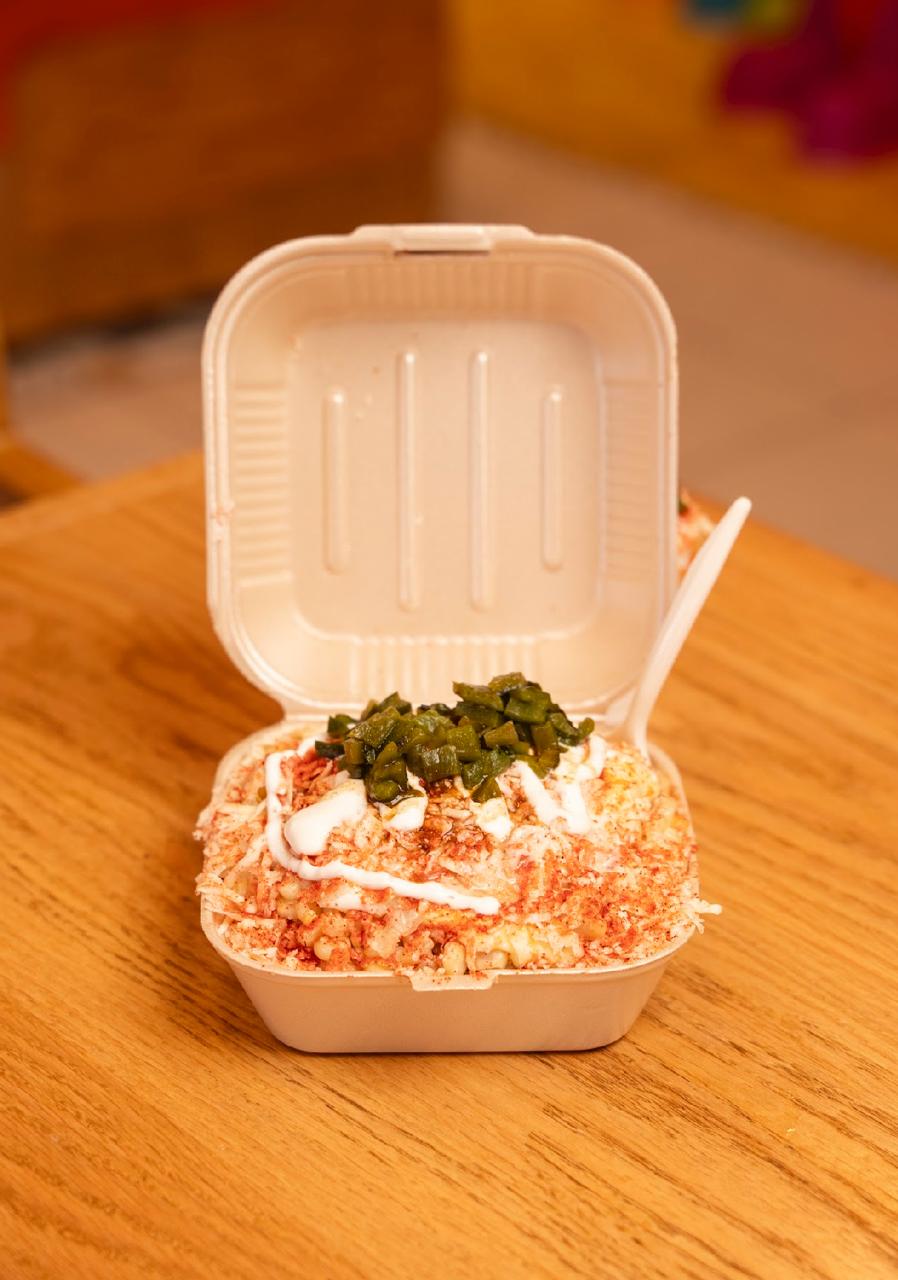 Elote desgranado con mayonesa, crema, mantequilla, queso chihuahua rallado y chile en polvo 4 oz.