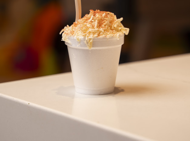 Elote desgranado con mayonesa, crema, mantequilla, queso chihuahua rallado y chile en polvo 10 oz.