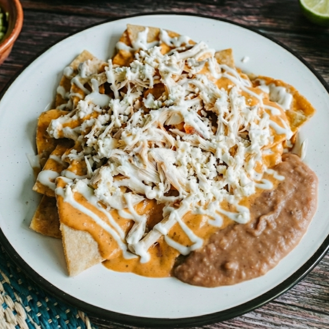 Crujientes chilaquiles bañados, incluye una porción de frijolitos.