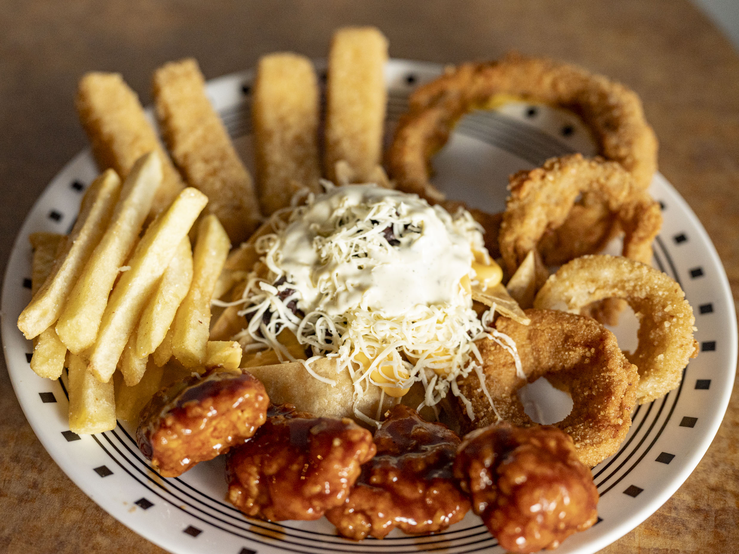 4 boneless, papas a la francesa, 4 aros de cebolla, 4 dedos de queso, nachos al centro.