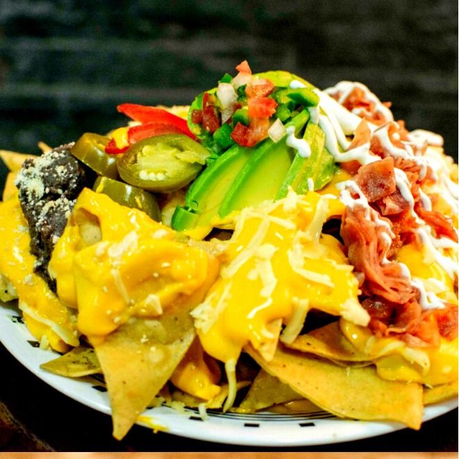 Totopos cubiertos con queso blanco, frijoles negros, queso amarillo, tocino, gúacamole y crema ¡¡Extremos!!