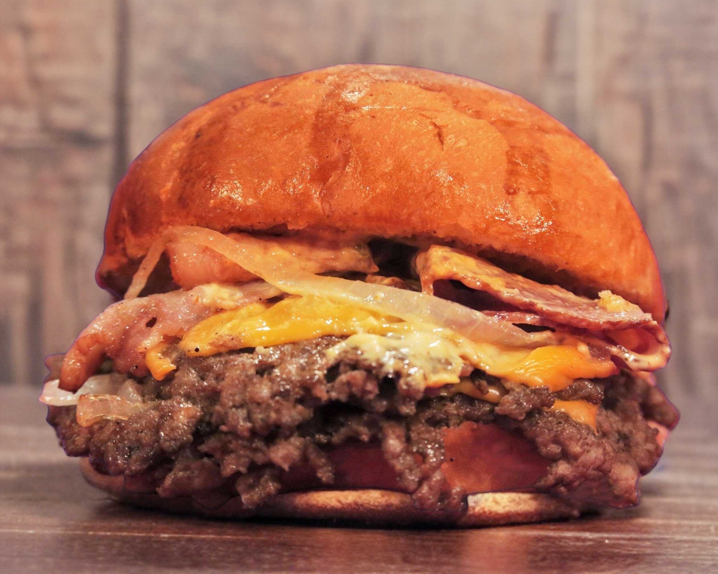 Hamburguesa con 200 g de carne, cheese, tocino y 100 g de papas fritas.