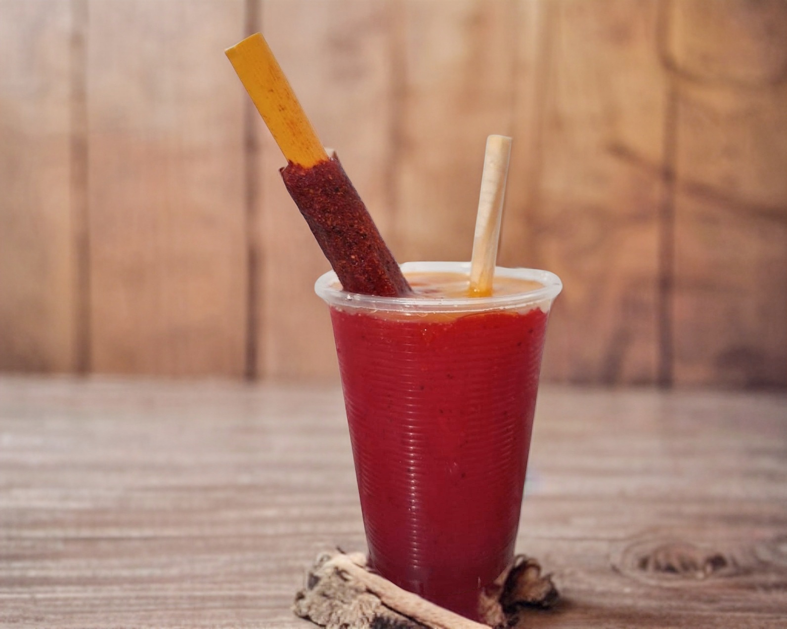 Cacahuates, pepino, cuerito, clamato, rielito, chamoy, chile en polvo, limón, salsa maggi y banderilla.