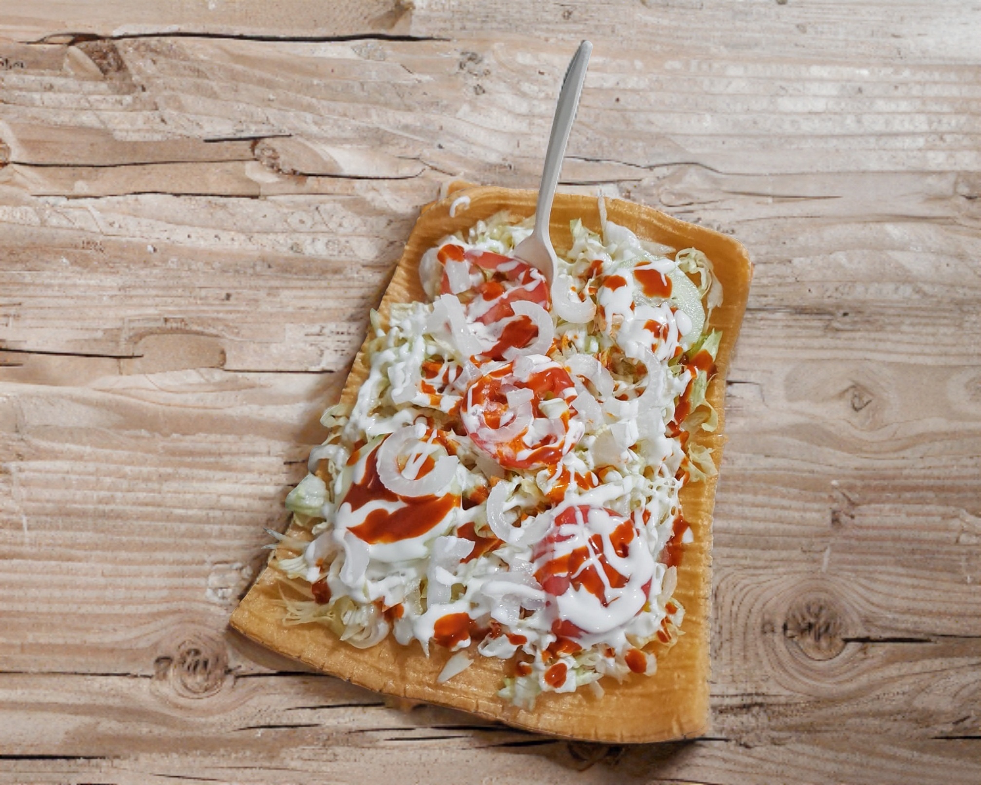 Lechuga, pepino, tomate, cueritos, crema y salsa.